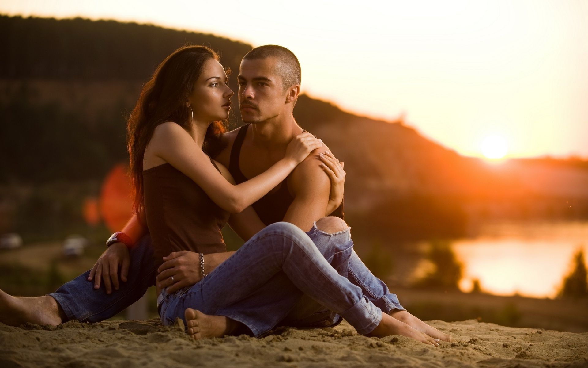 Um cara com uma garota na praia ao lado do mar olhando para o céu azul