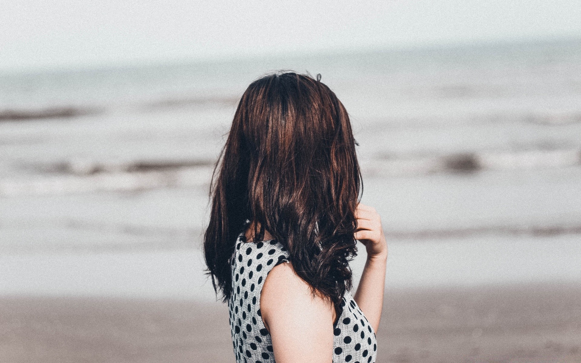 Menina em um vestido encontra-se na praia para a águaMenina em um vestido encontra-se na praia para a água