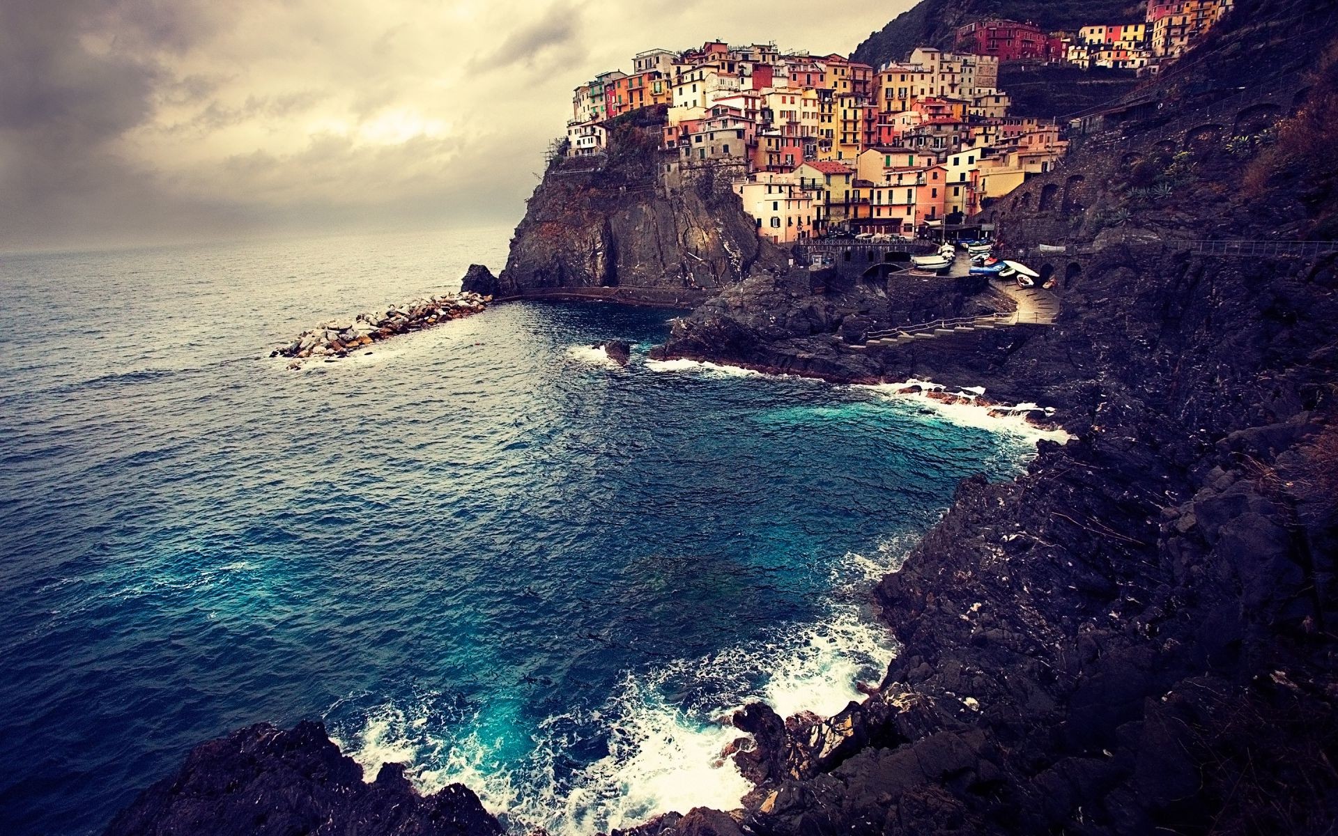 Casas na rocha junto ao mar azul