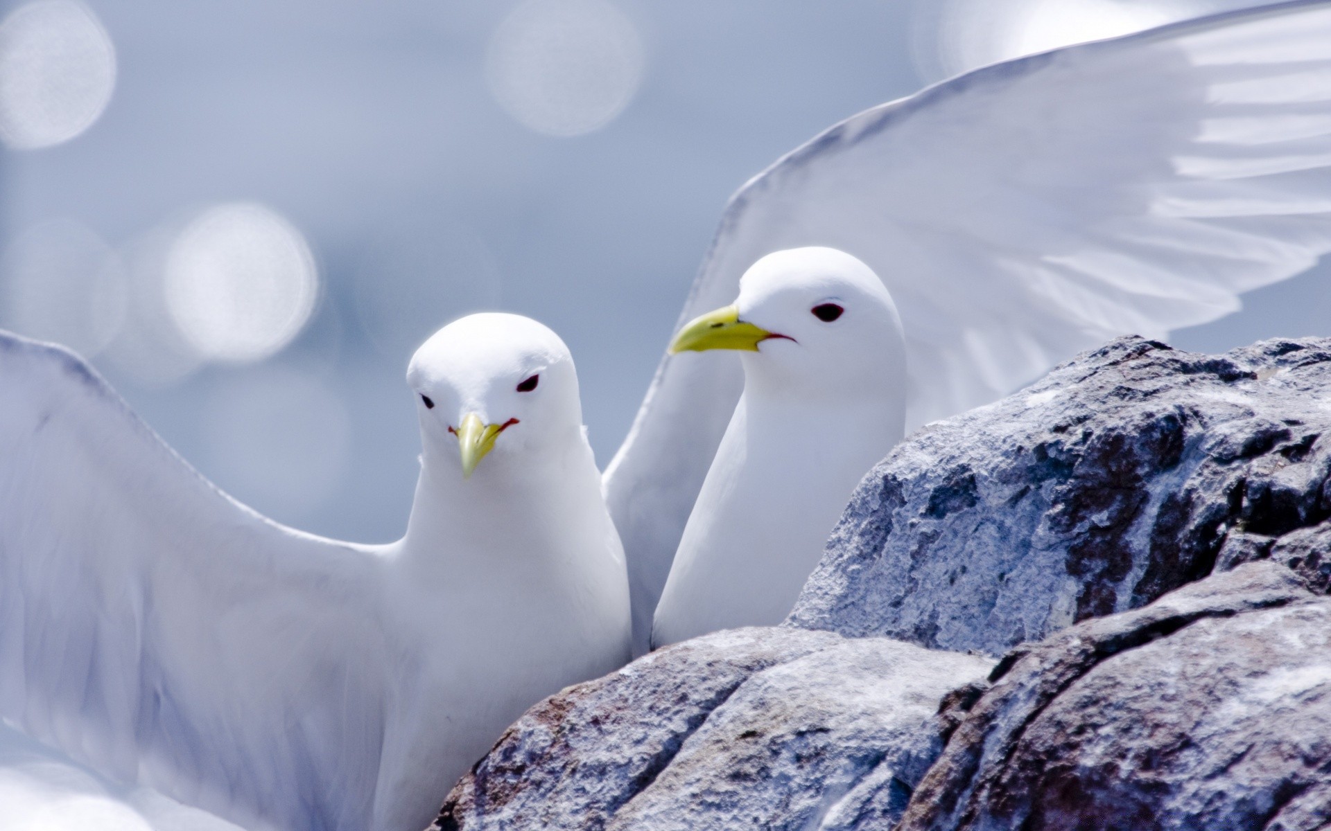 Pássaros brancos se misturam com a neve