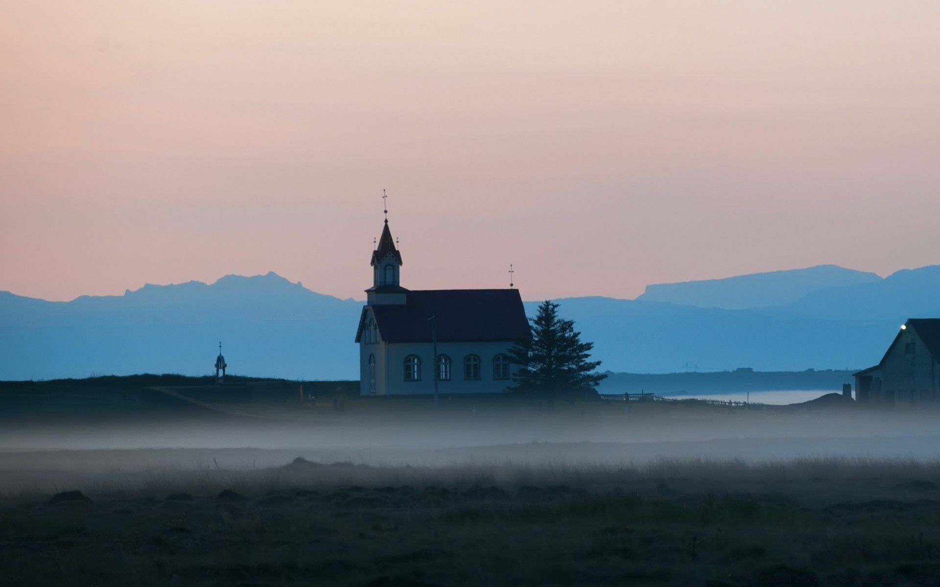 O nevoeiro da manhã engoliu o campo. Árvore solitária