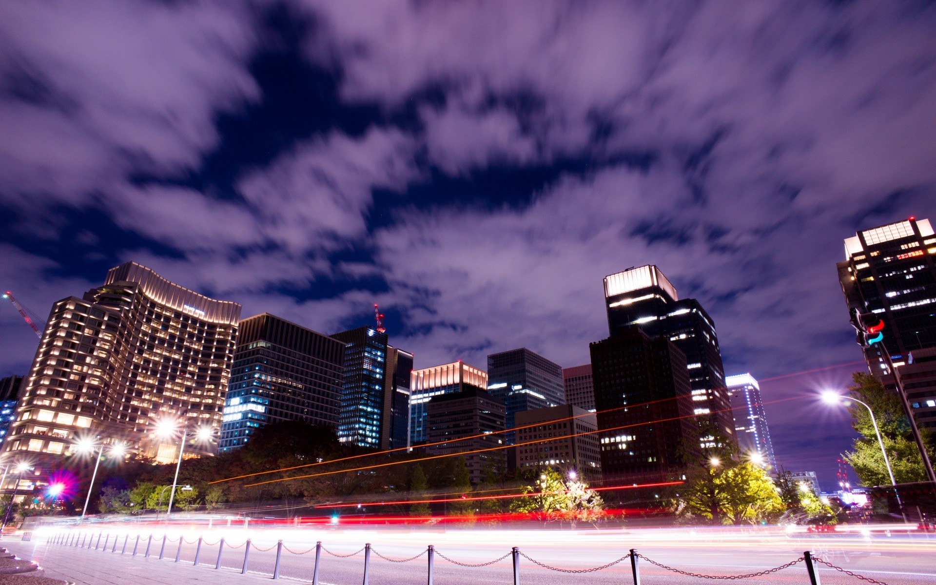 Uma cidade asiática com um arranha-céu e um corpo de água