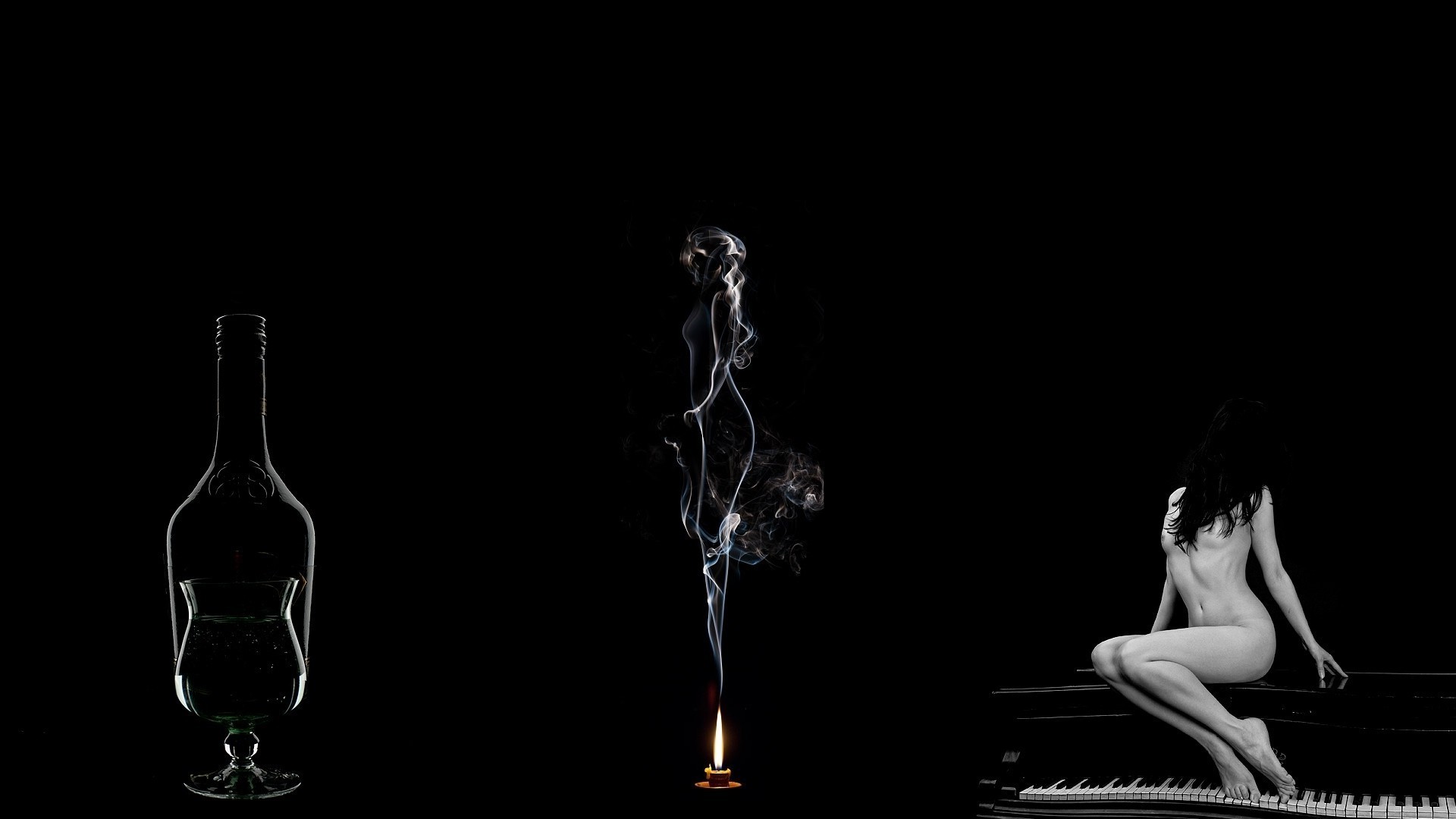 Comparação monocromática mulher nude vidro de fogo no fundo preto
