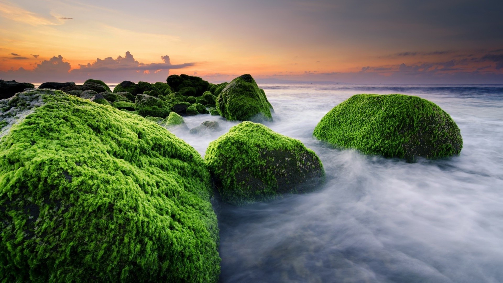 Pedras cobertas de musgo no nevoeiro