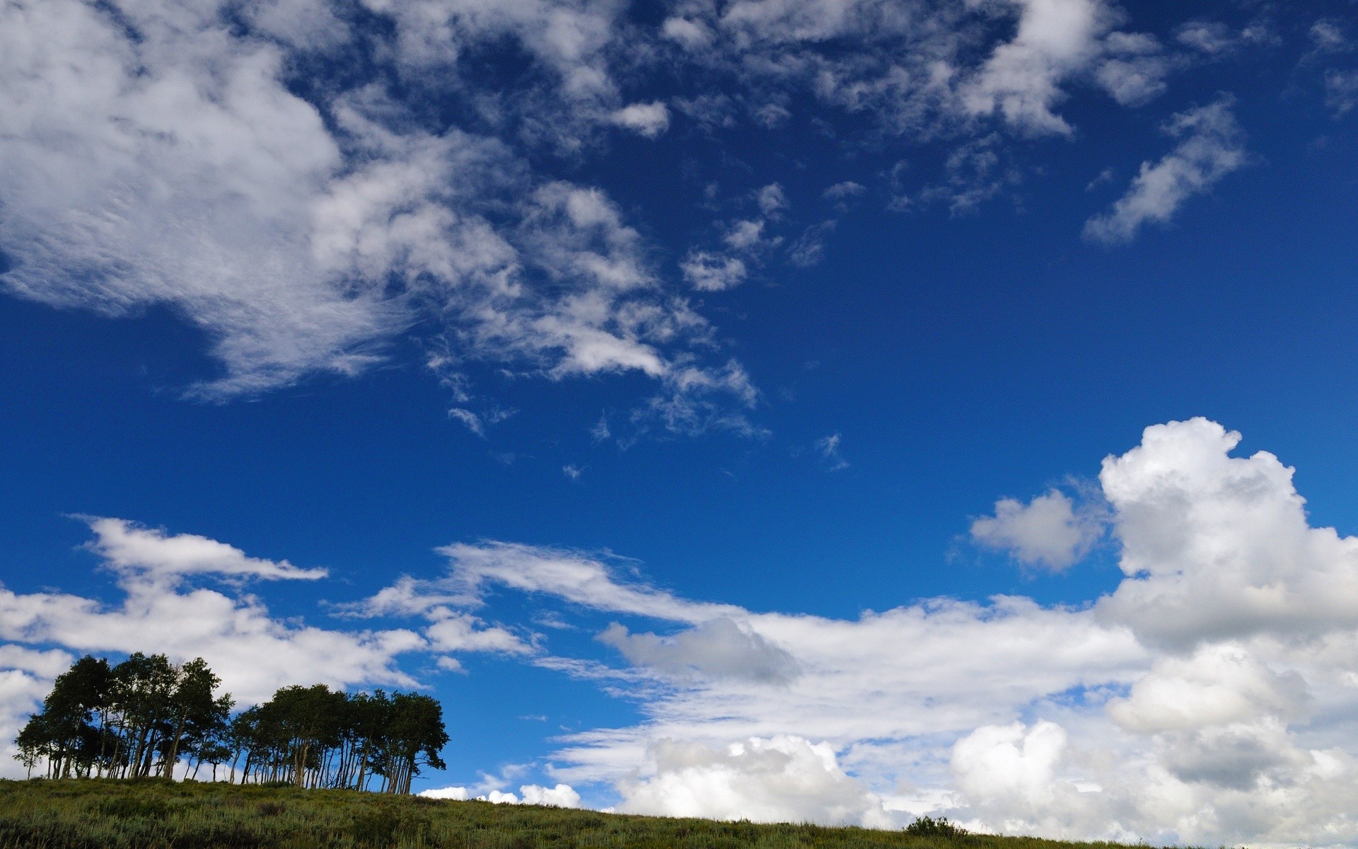 Paisagem. Céu azul. Nuvens no céu. Árvore verde. Grama verde