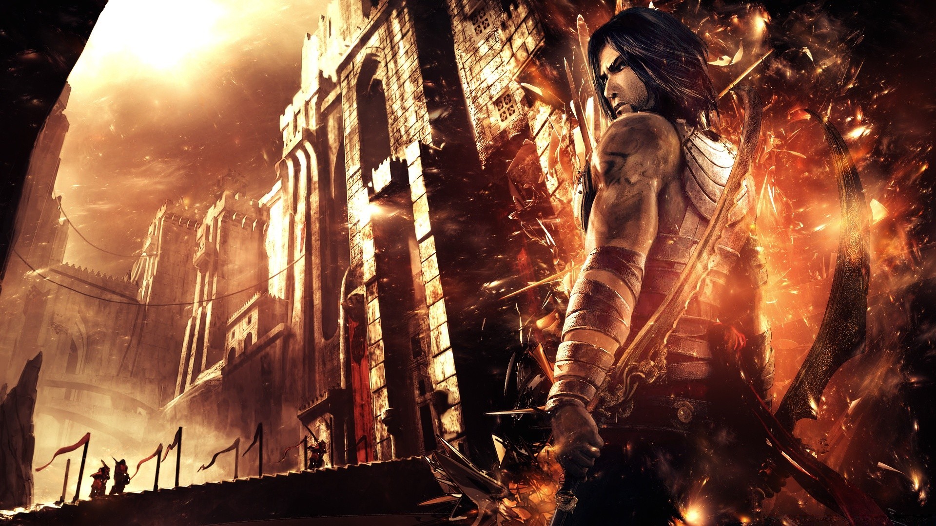Uma cidade pós-apocalíptica e um homem com um arco nas costas