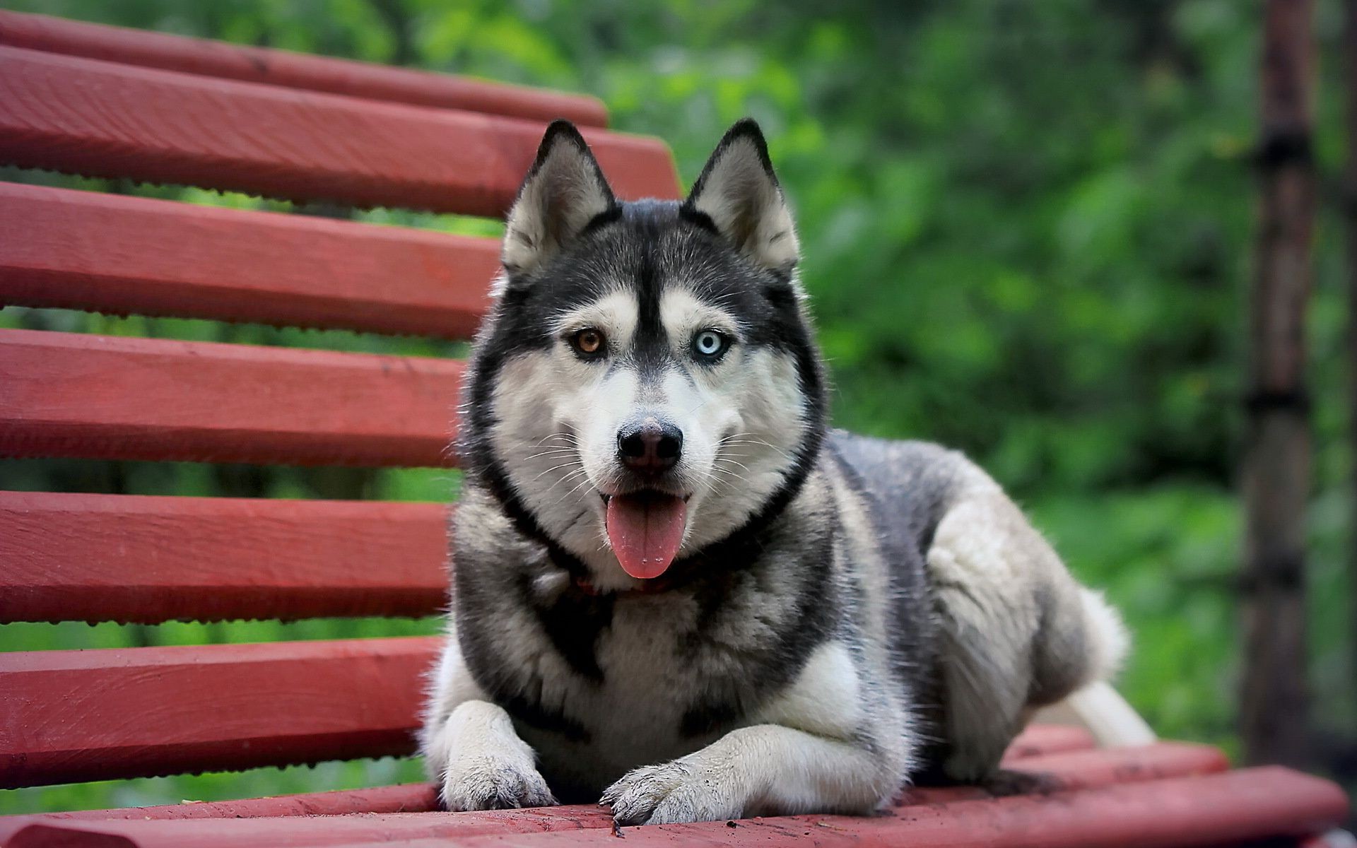 Cão com olhos diferentes e língua para fora está deitado em uma loja