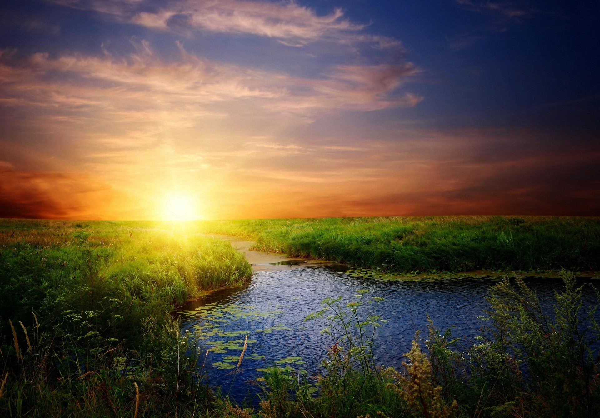 Rio na grama verde ao pôr do sol