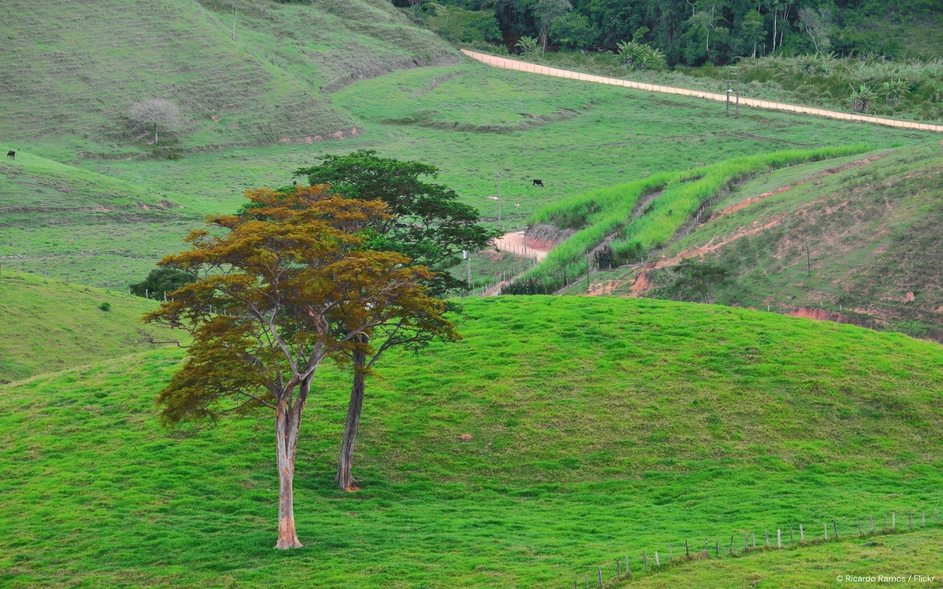 A superfície espelhada do lago reflete o céu, os picos das montanhas e as árvores