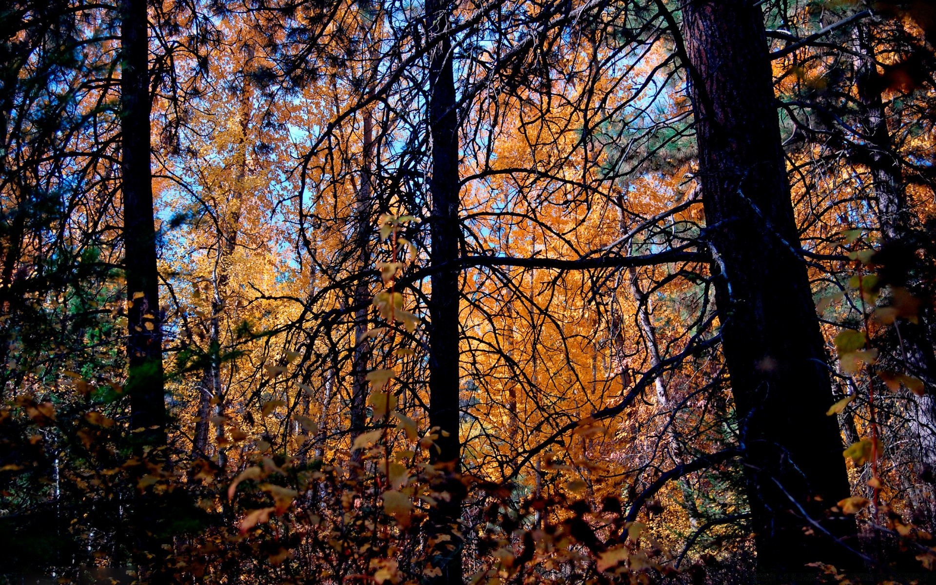 Árvores no fundo do sol do pôr-do-sol. Paisagem de outono