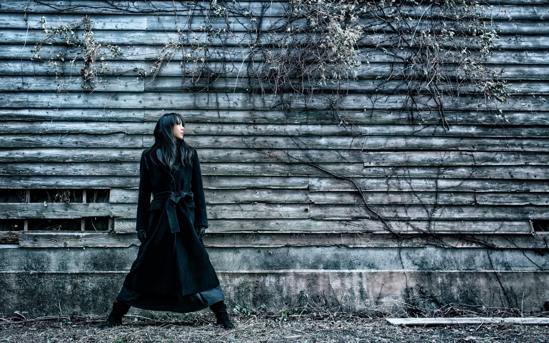 Menina em uma capa de chuva no fundo de um velho celeiro