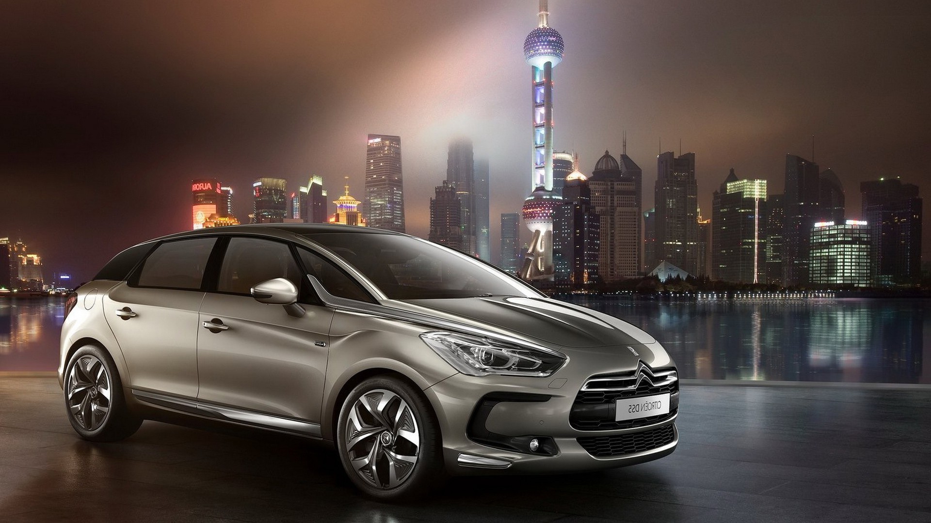 Carro cinza Citroen contra o pano de fundo da cidade noturna