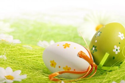 Ovos de páscoa e camomila na grama lee com os raios do sol caindo sobre eles meOvos de Páscoa e camomila na grama Lee com os raios do sol caindo sobre eles me