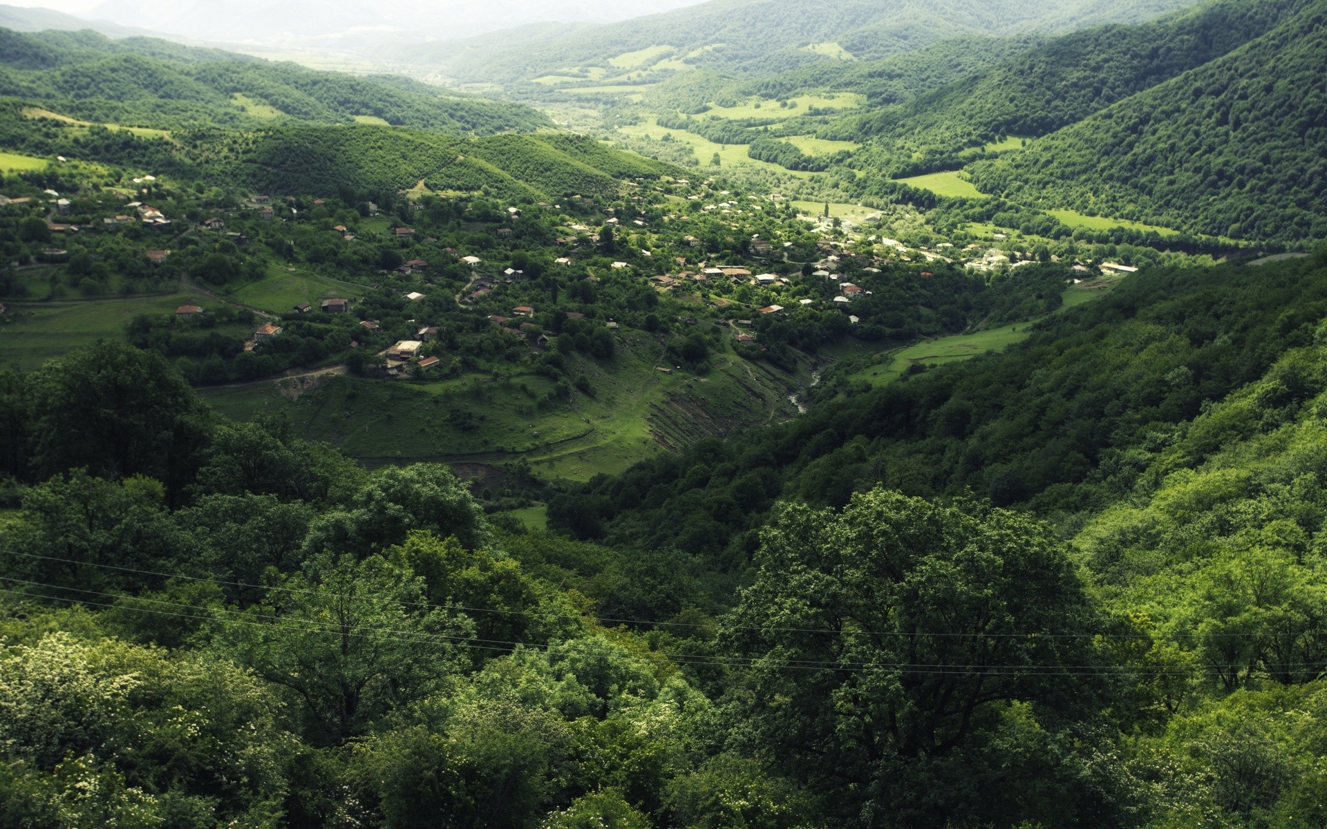 Paisagem de montanhas, árvores e grama