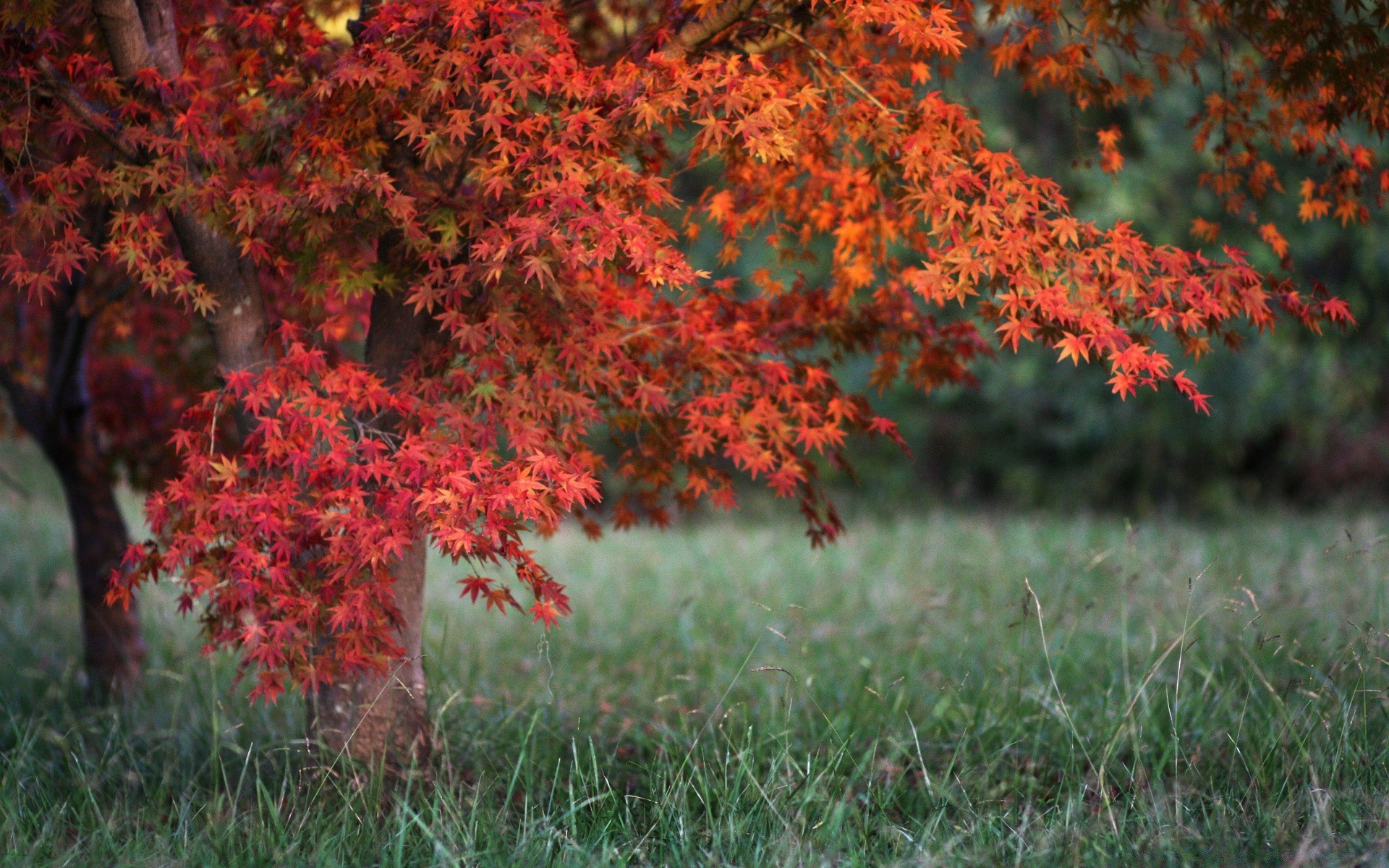 Contraste brilhante de vermelho e verde. Paisagem de outono