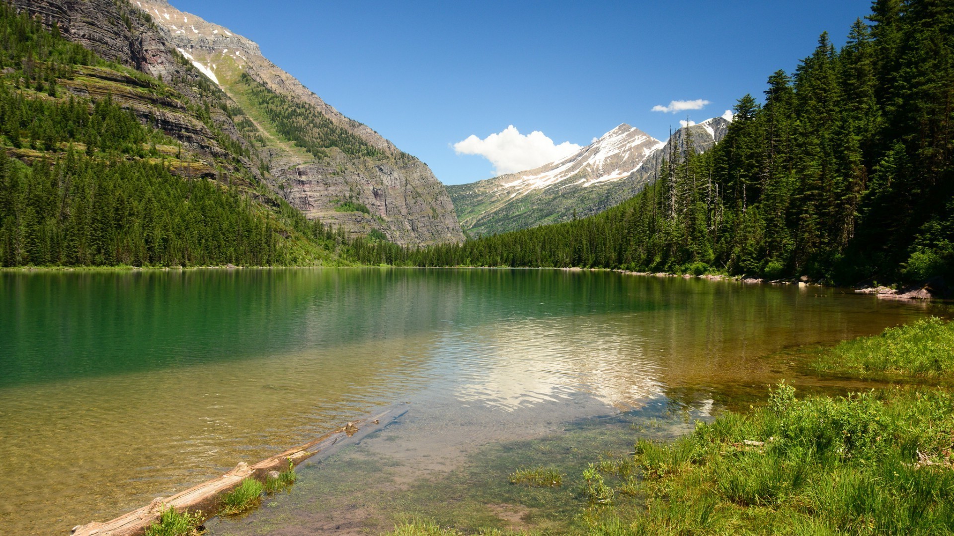 Paisagem do lago cercada por montanhas e floresta