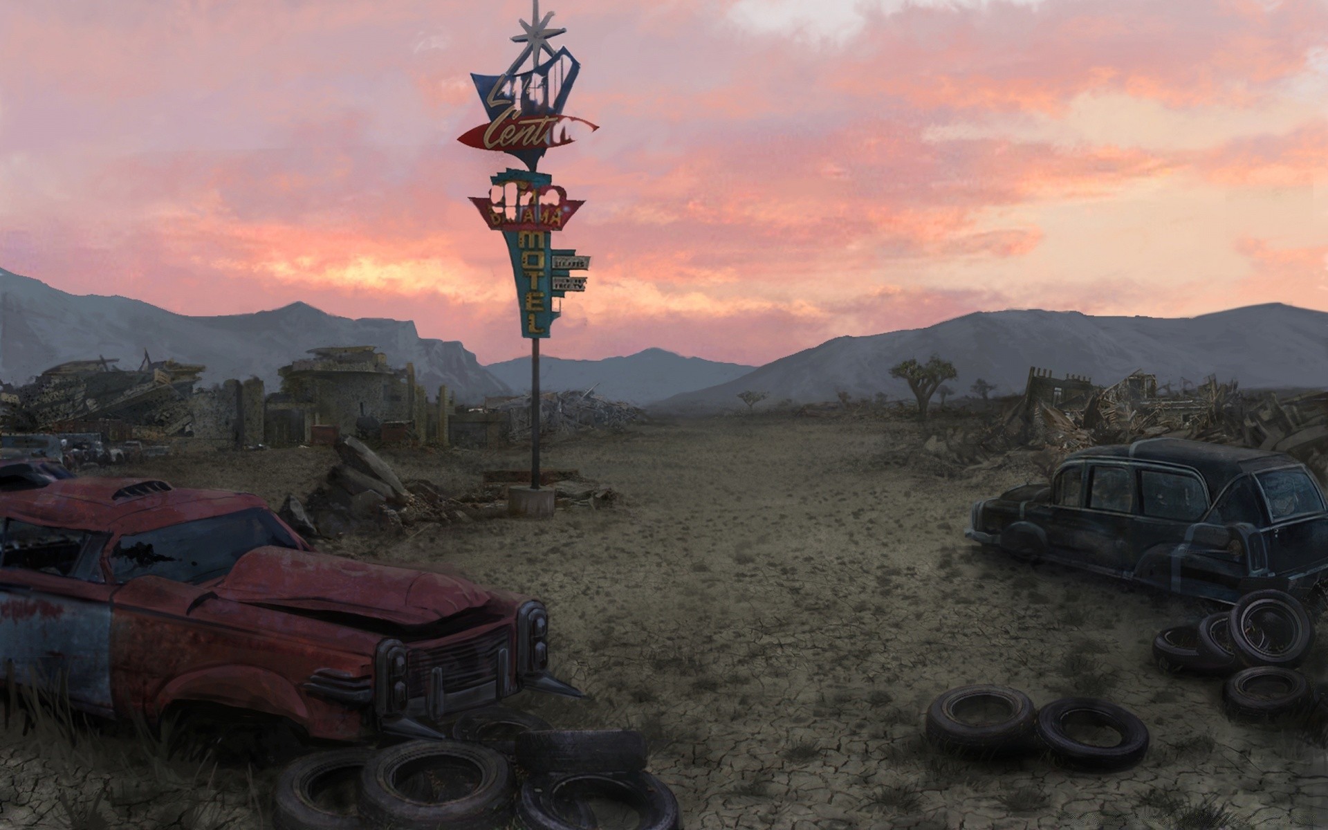 Um prado de montanha com flores roxas e carmesim e um tronco no fundo da montanha e o céu do pôr do sol no canto esquerdo do sol