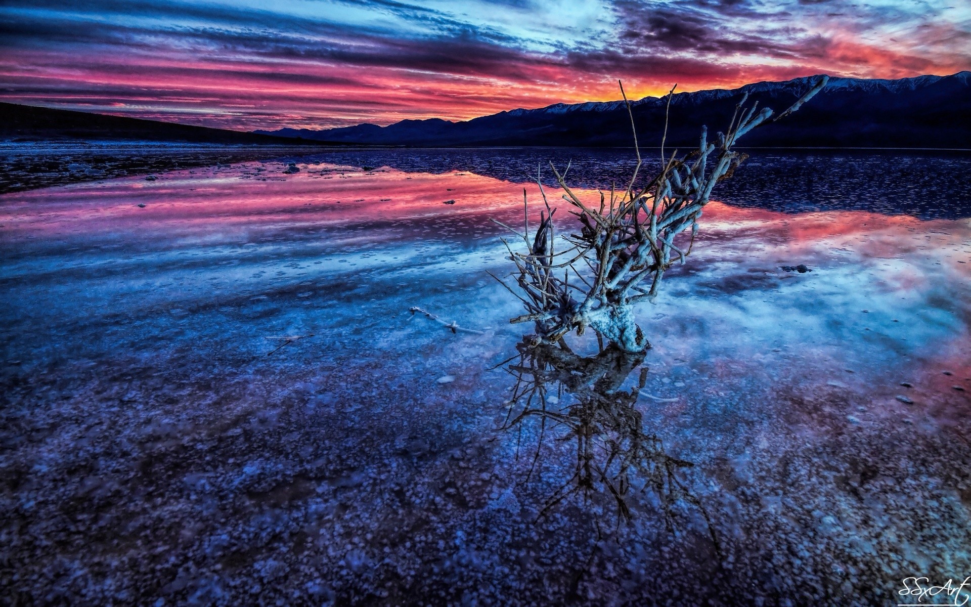 Paisagem do lago ao pôr do sol com reflexão de árvores