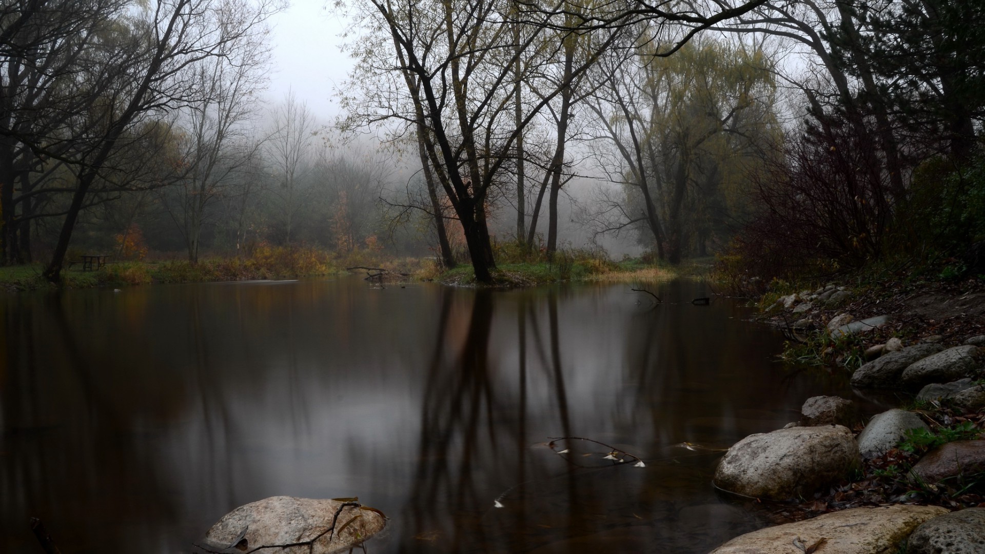 Um lago cercado por árvores, em uma floresta sombria