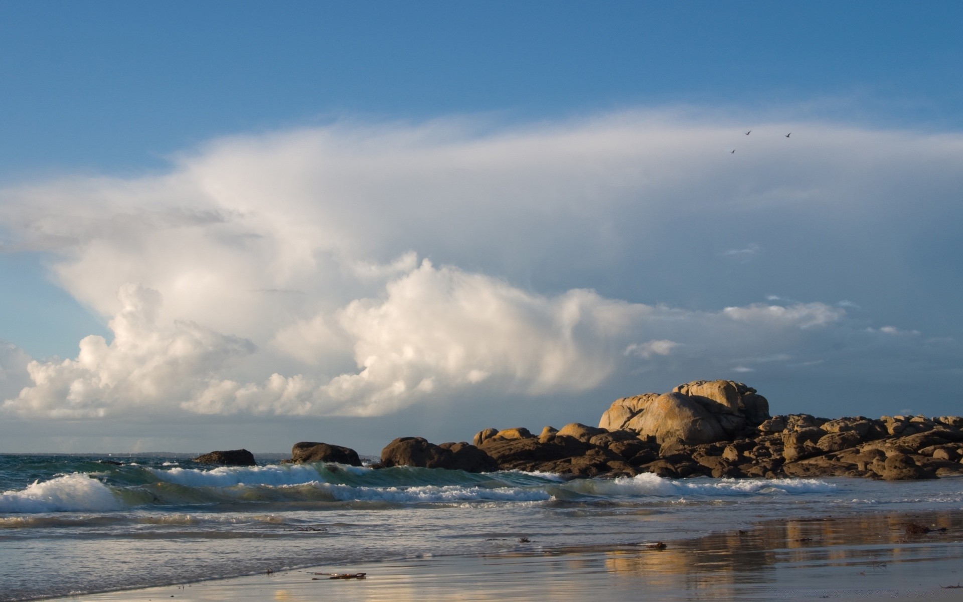Ondas em uma costa arenosa contra um fundo de nuvens