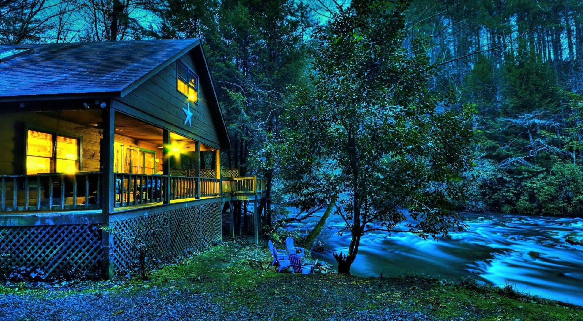 Casa na floresta noturna junto ao rio