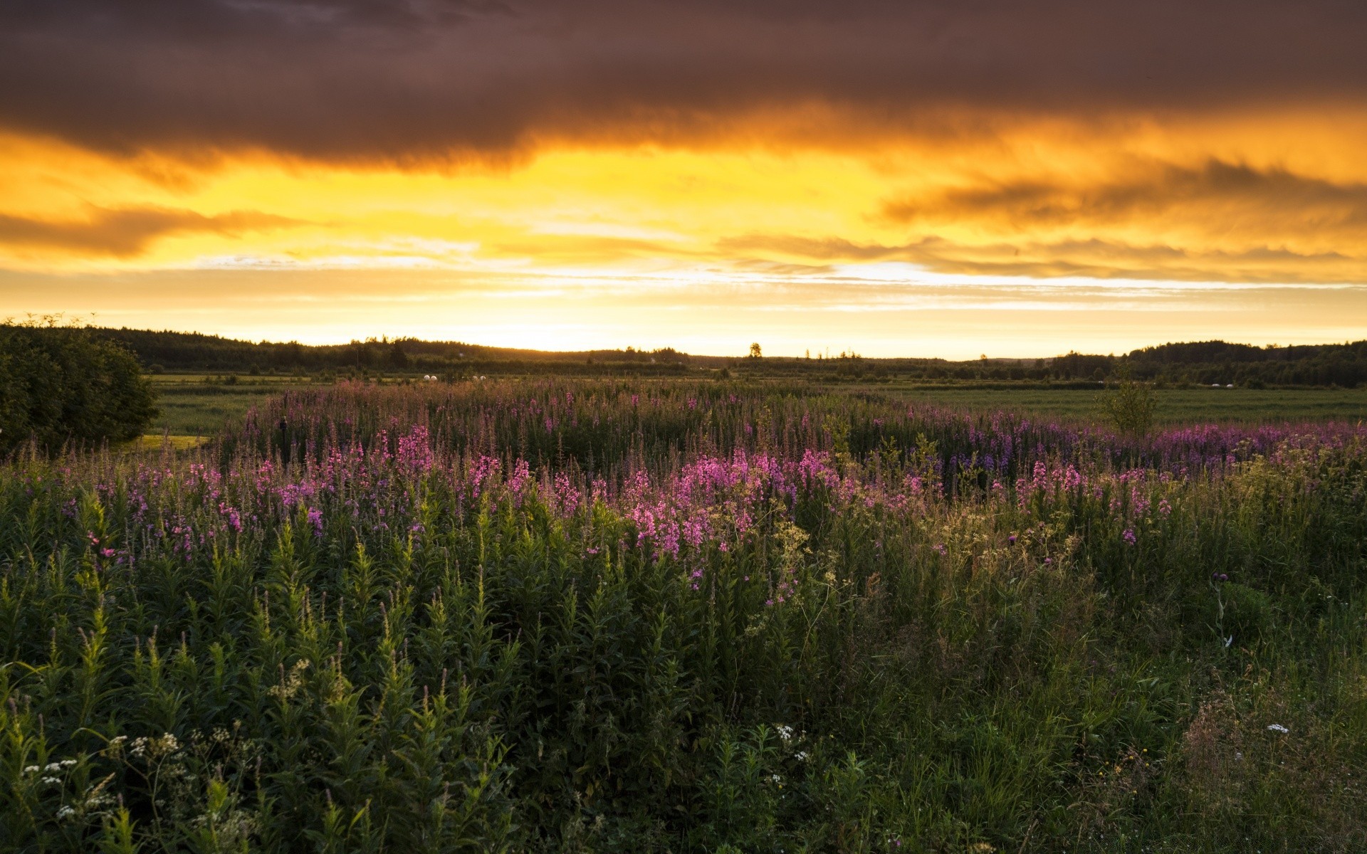Paisagem de Verão lânguida ao pôr do sol