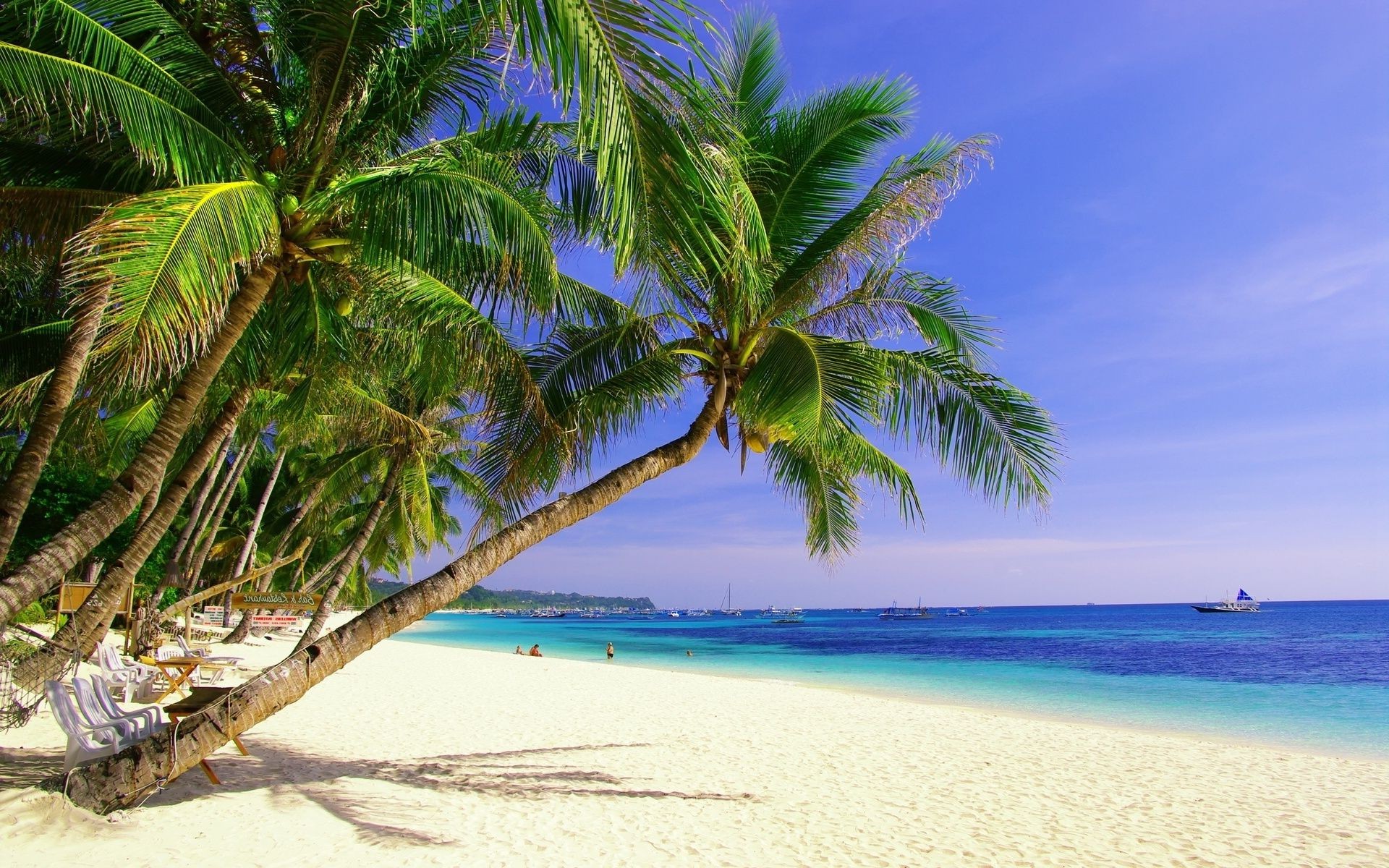 Palmeiras inclinadas contra um fundo de praia arenosa