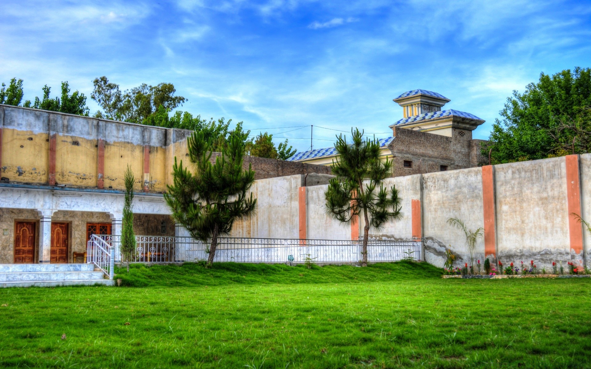 Gramado verde atrás da cerca de pedra