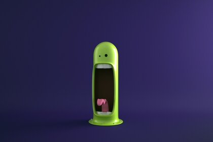 A cápsula monstro verde abriu a boca para que você possa ver a línguaA cápsula monstro verde abriu a boca para que você possa ver a língua