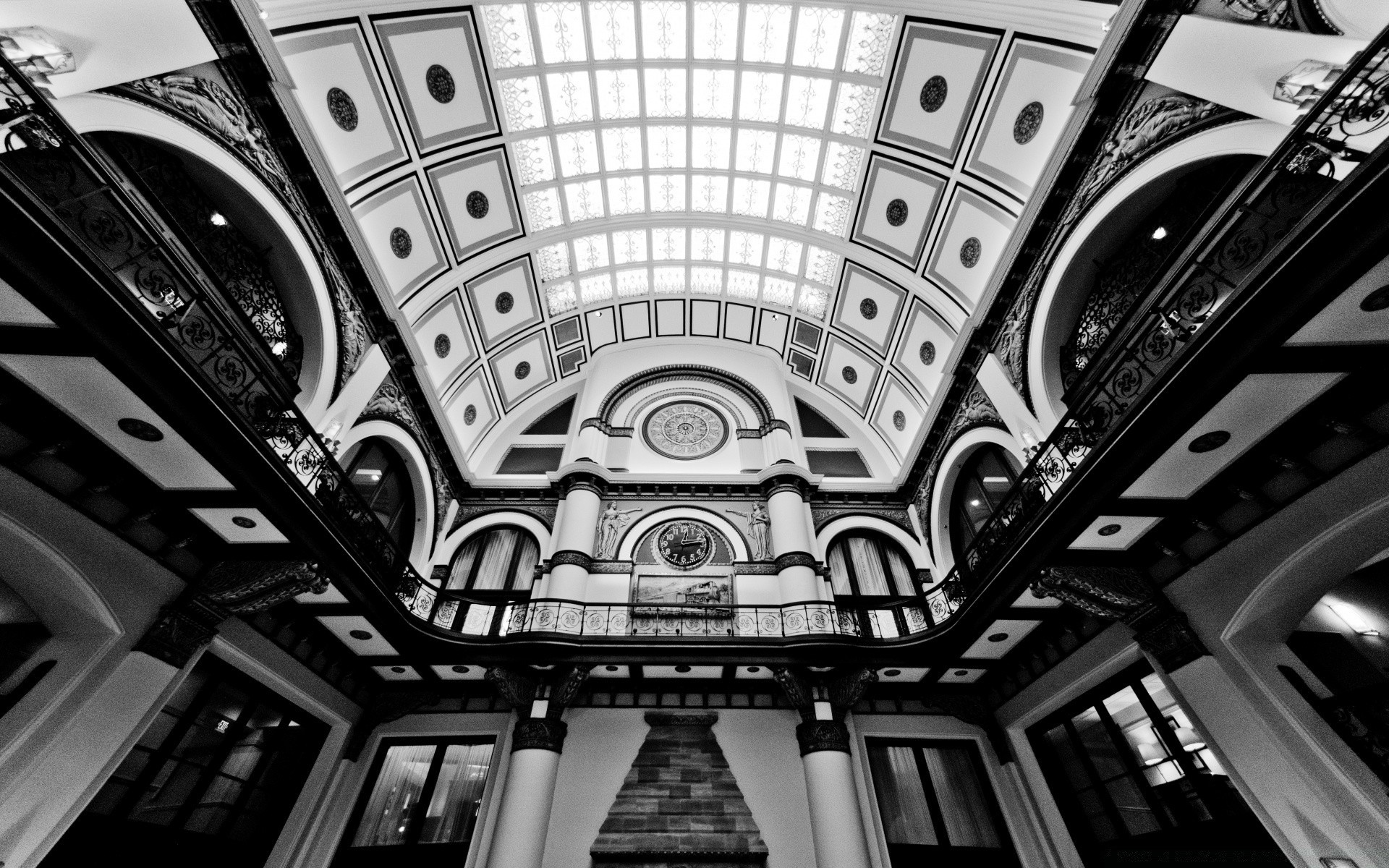 Relógio na parede de um enorme salão em preto e branco