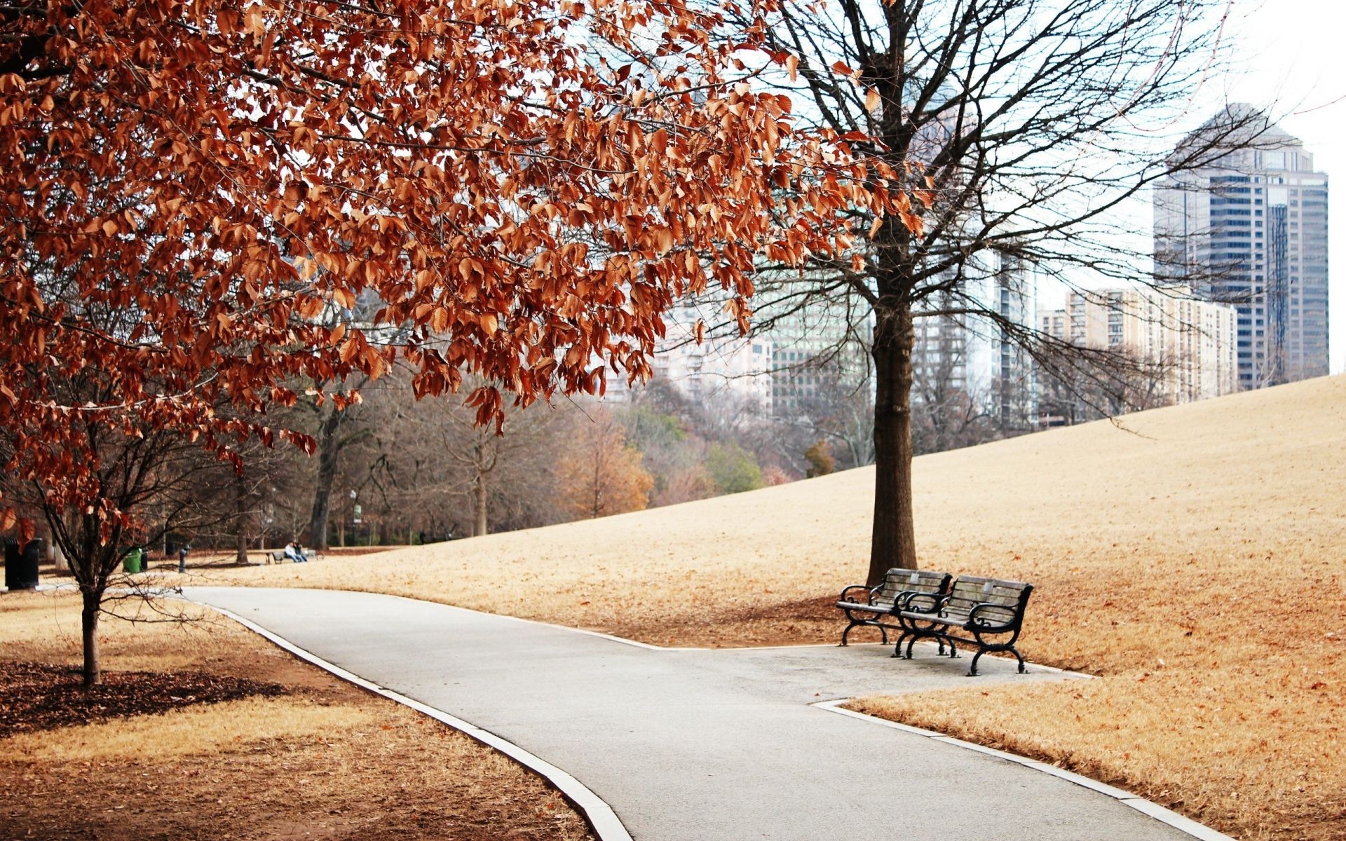 Banco no parque de outono no fundo de arranha-céus