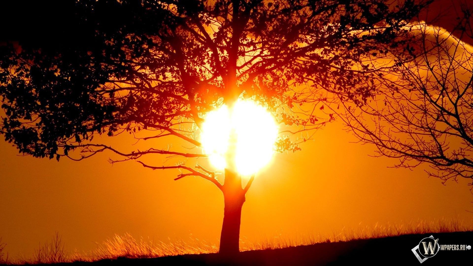 Árvore de folha caduca em contraluz pelo sol do pôr do sol