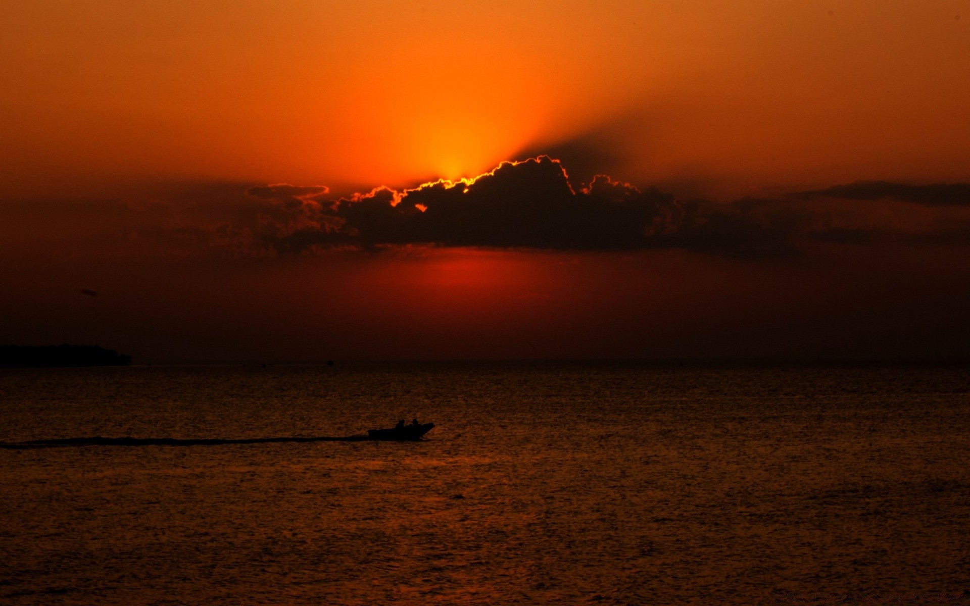 Barco corre pelo mar ao pôr do sol