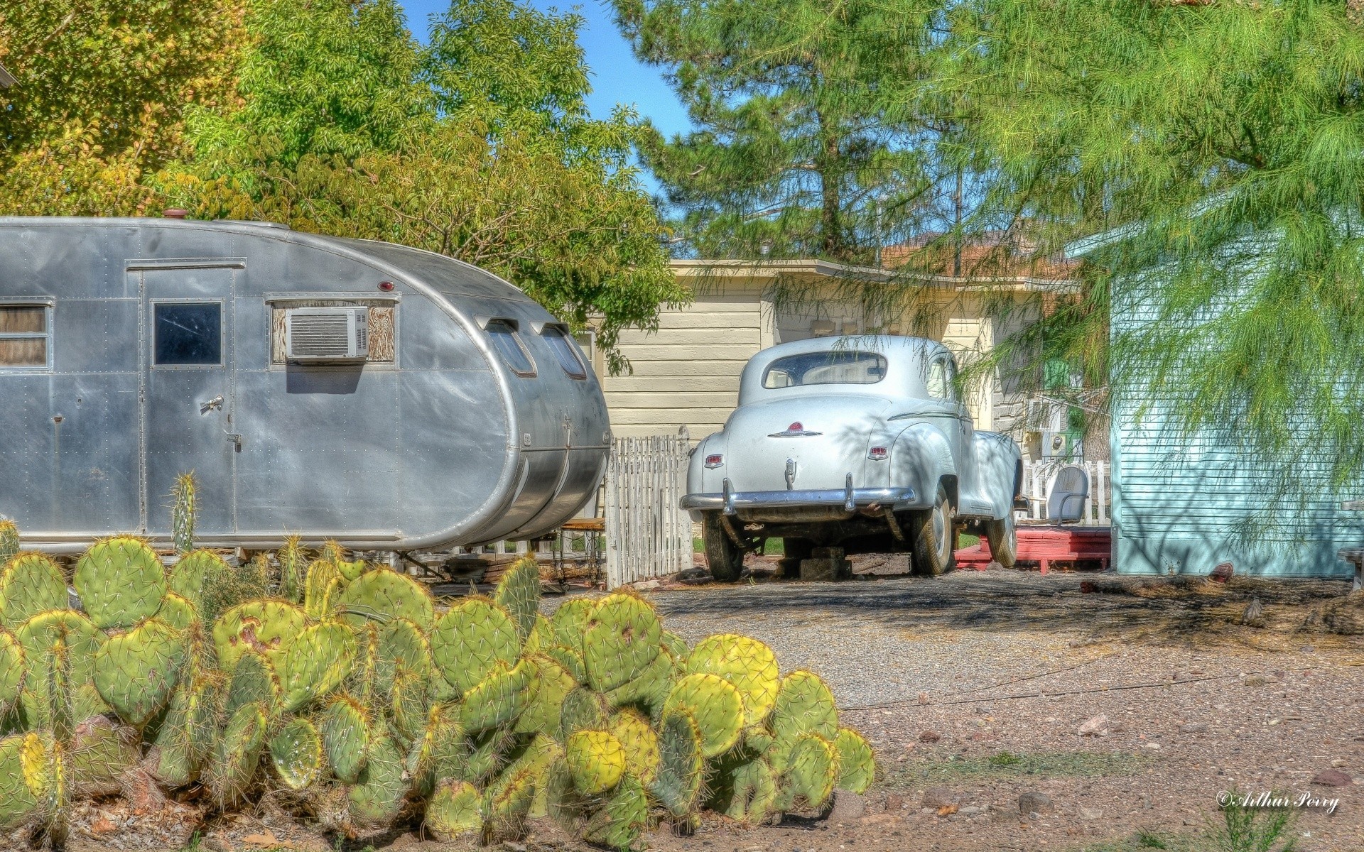 Cactos, carro velho, casa-reboque, uchatstock da terra