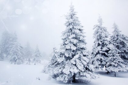 Floresta de inverno com árvores de natal cobertas de neve e amanhecerFloresta de inverno com árvores de Natal cobertas de neve e amanhecer