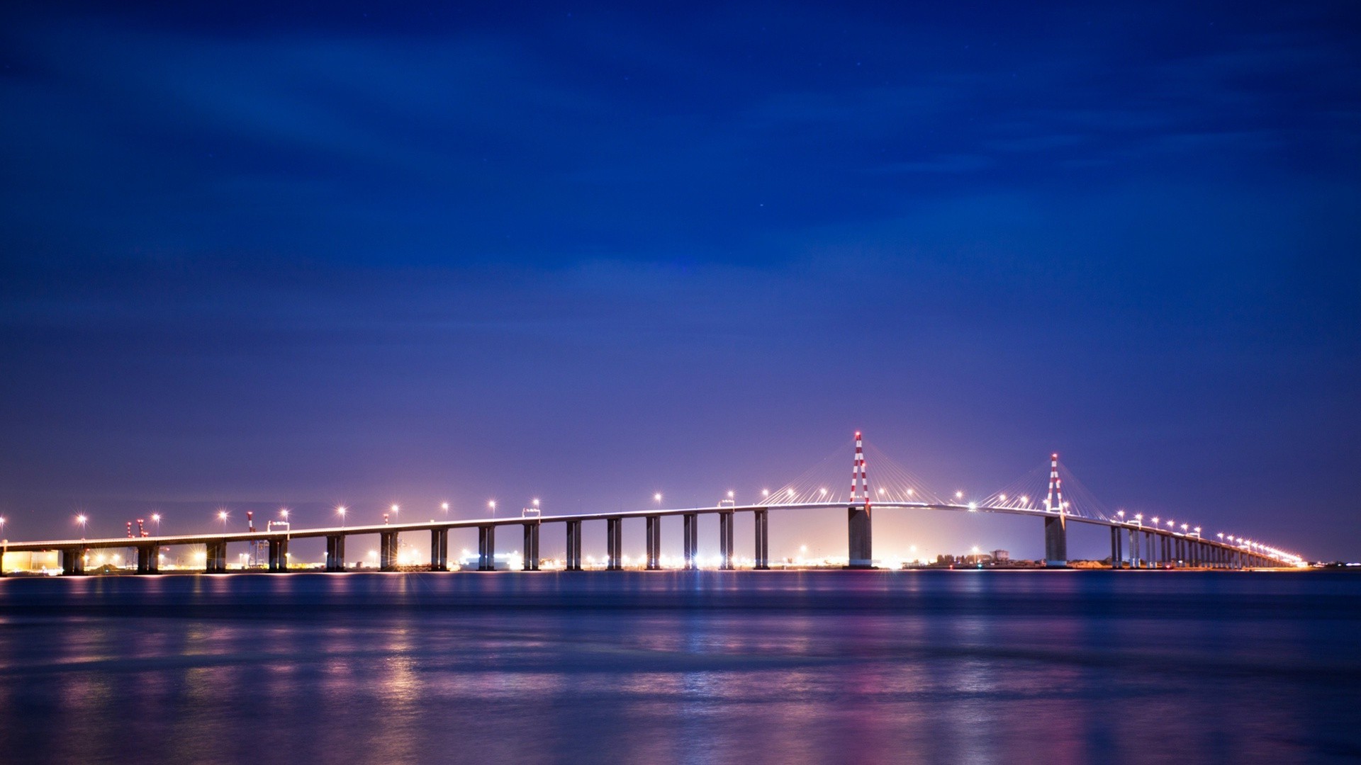 Paisagem azul com arranha-céus e Ponte. Sobre