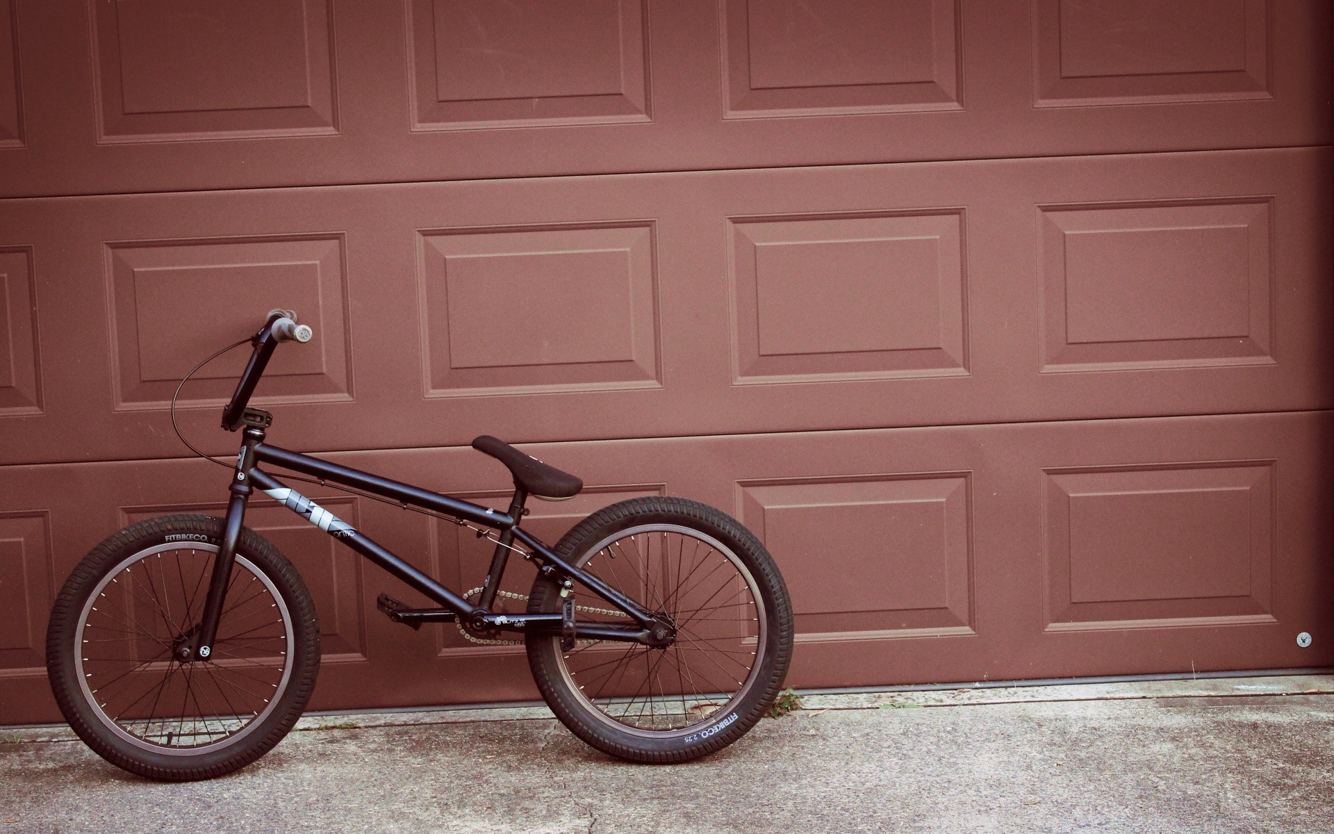 Bicicleta ao lado da porta da garagem, semelhante a uma barra de chocolate