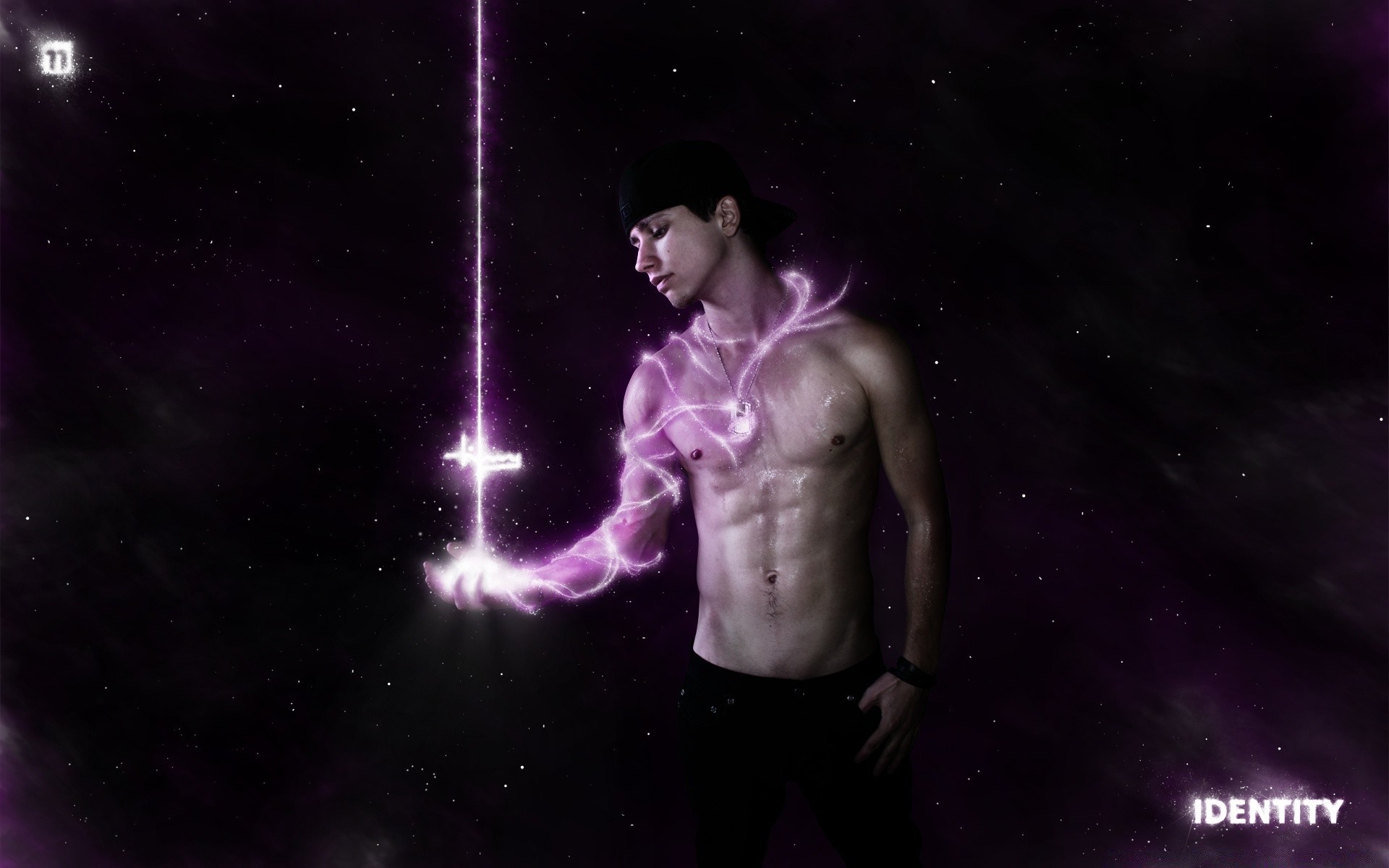 Homem nu segurando um sabre de luz
