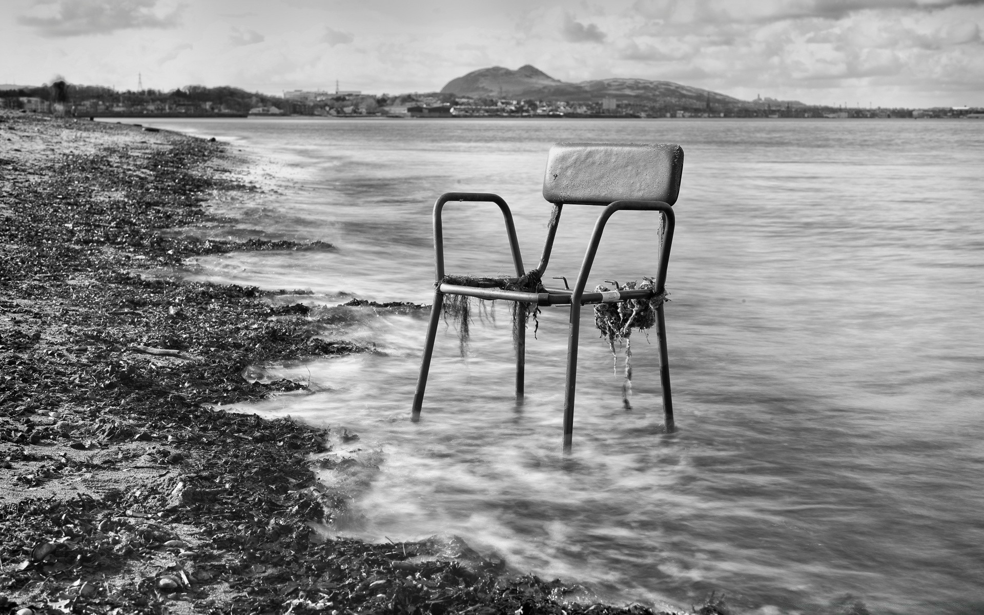 Mesa e cadeiras no fundo da praia e do pôr do sol