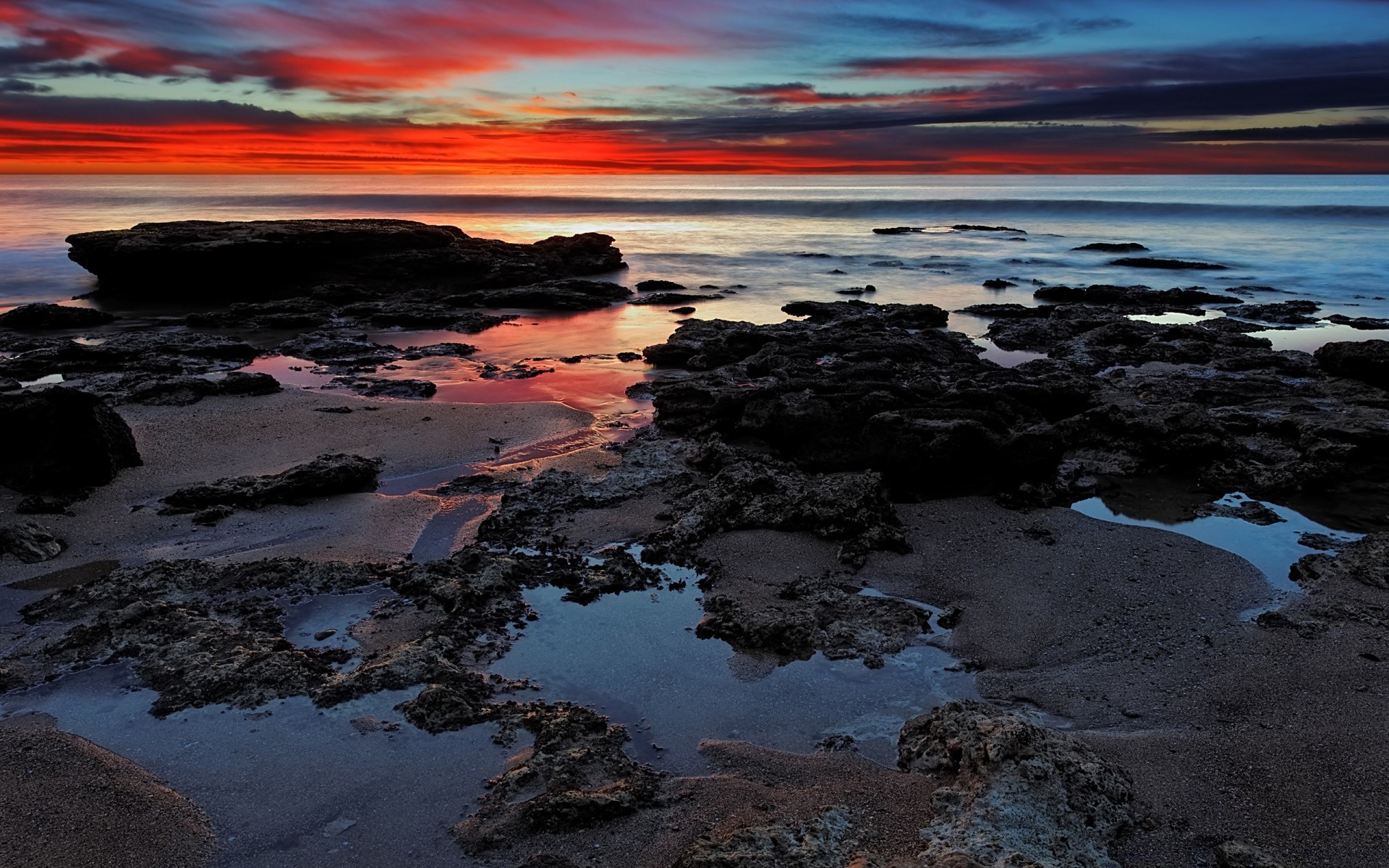 Pôr do sol na praia selvagem. Lugares desconhecidos