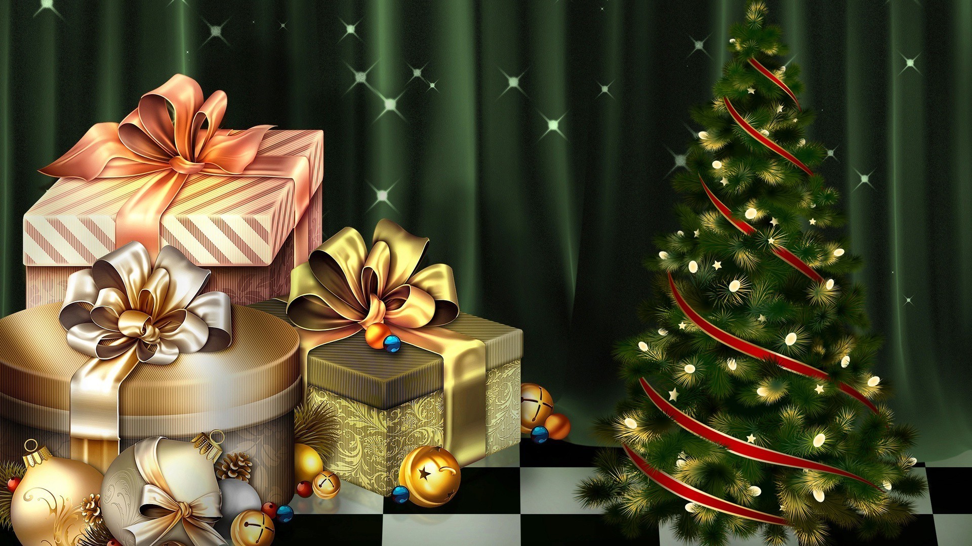 Ilustração de Ano Novo, Árvore de Natal com presentes
