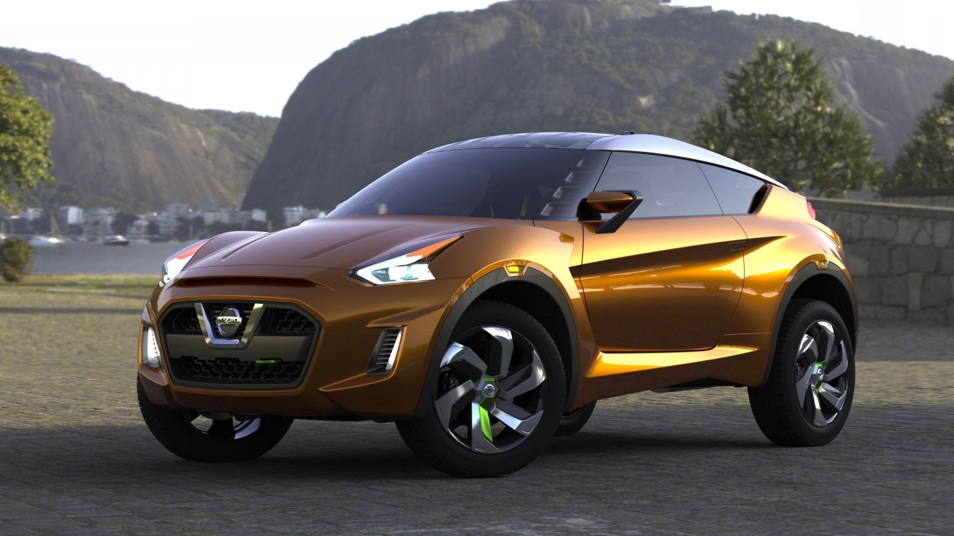 Carro marrom no fundo da montanha