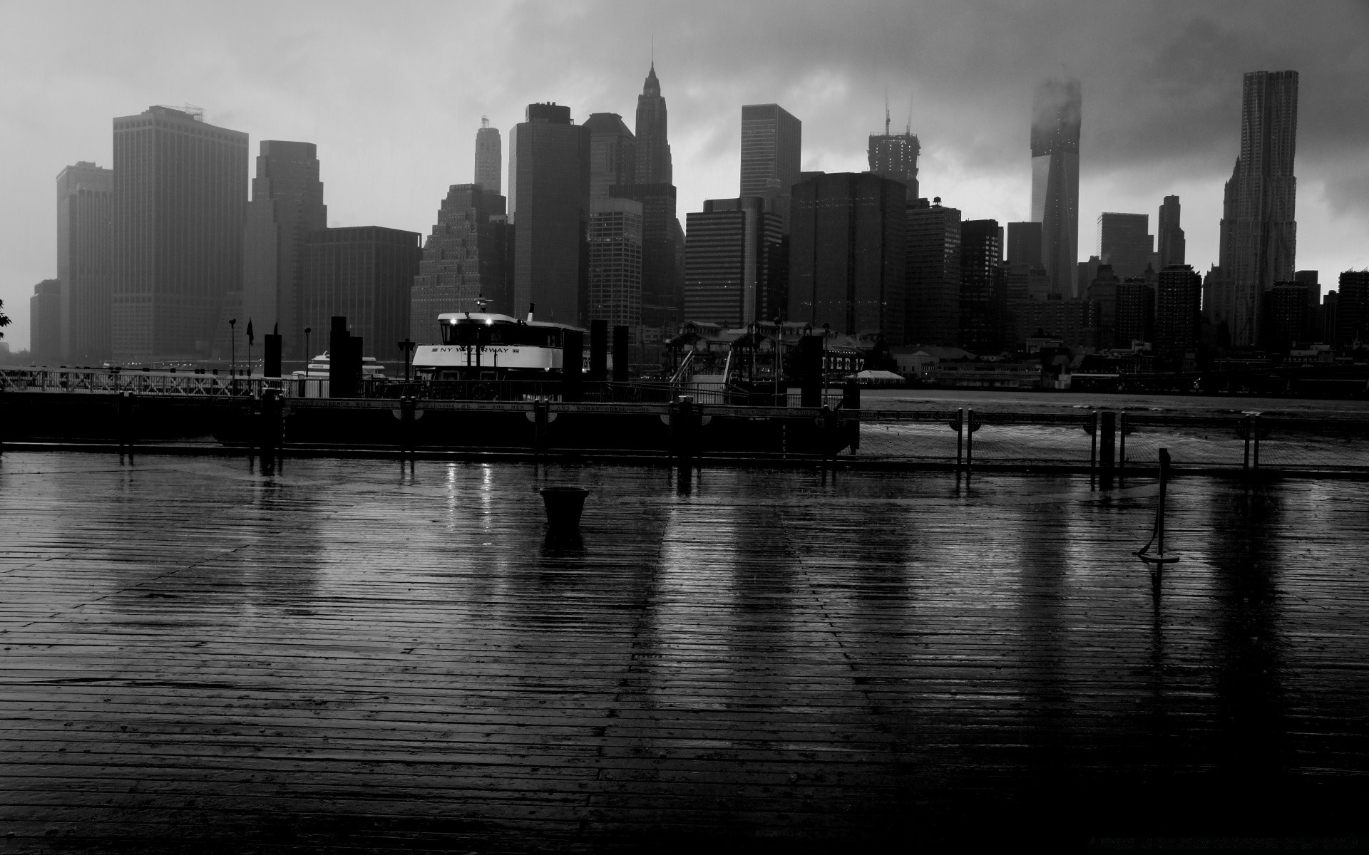 Foto em preto e branco de uma paisagem urbana com arranha-céus