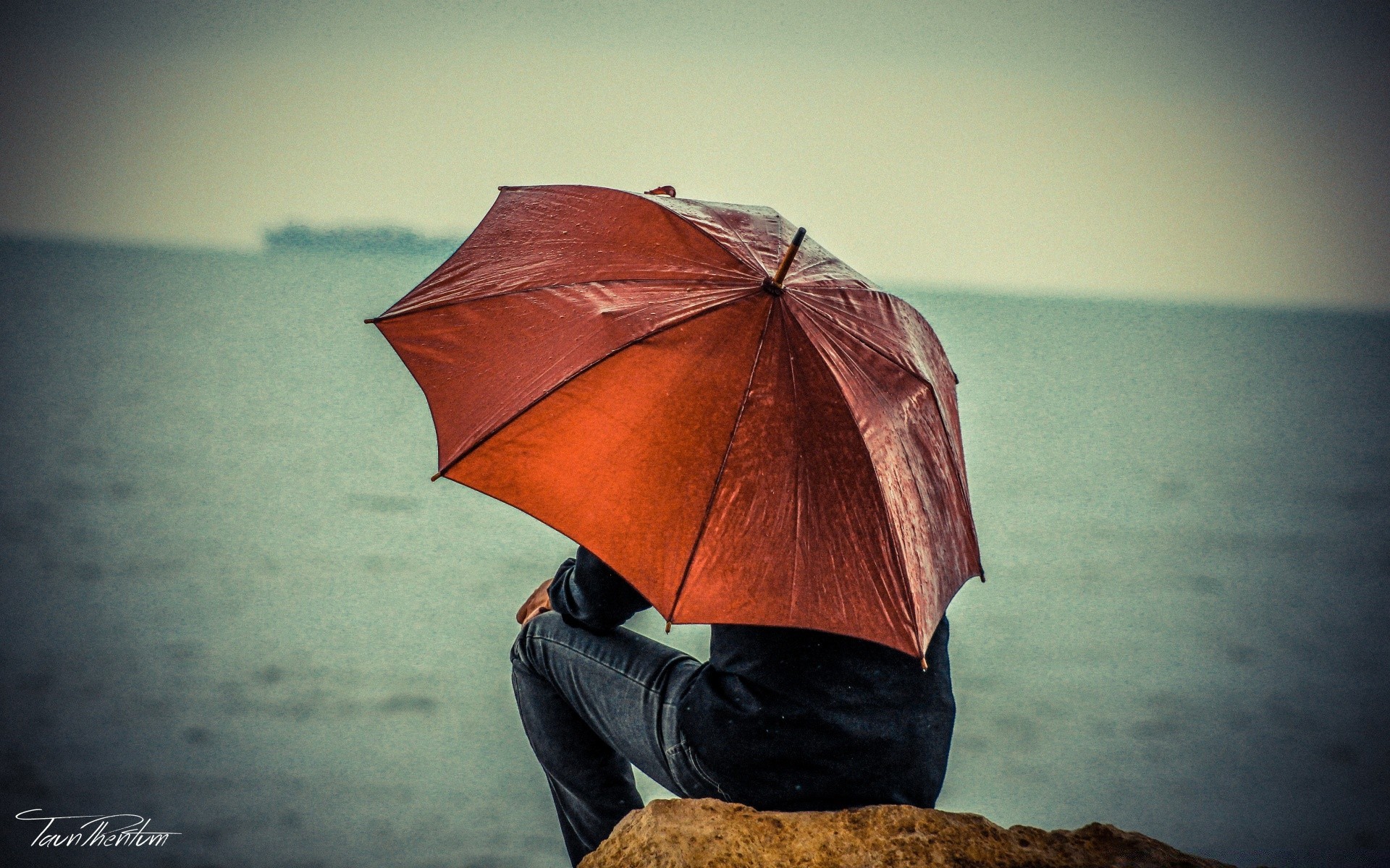Homem sentado em uma pedra à beira-mar sob um guarda-chuva vermelho