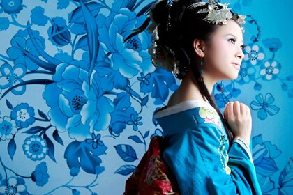 Guerreira em quimono entre as pétalas de cerejeiraGuerreira em quimono entre as pétalas de cerejeira