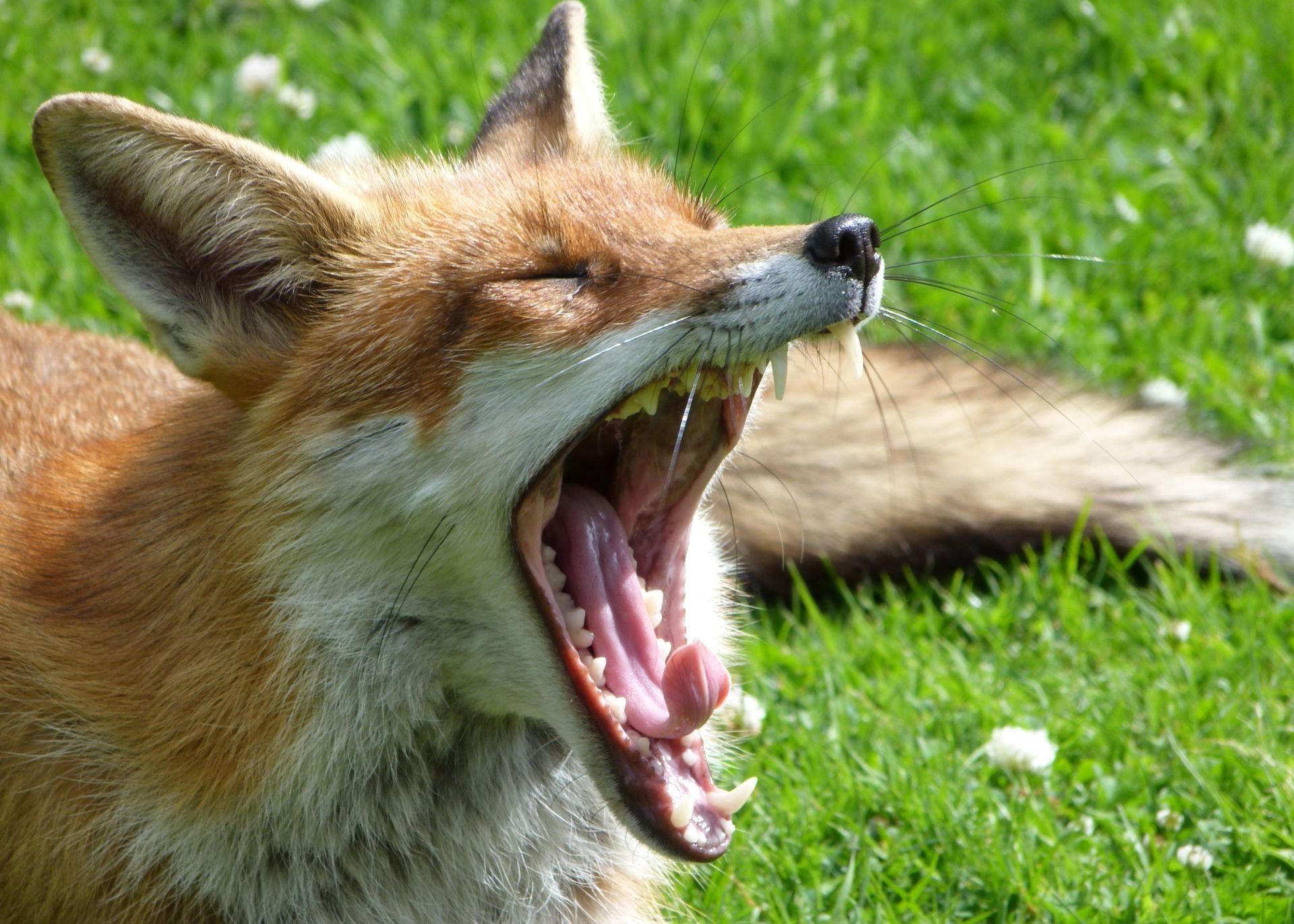 Raposa boceja deitado na grama