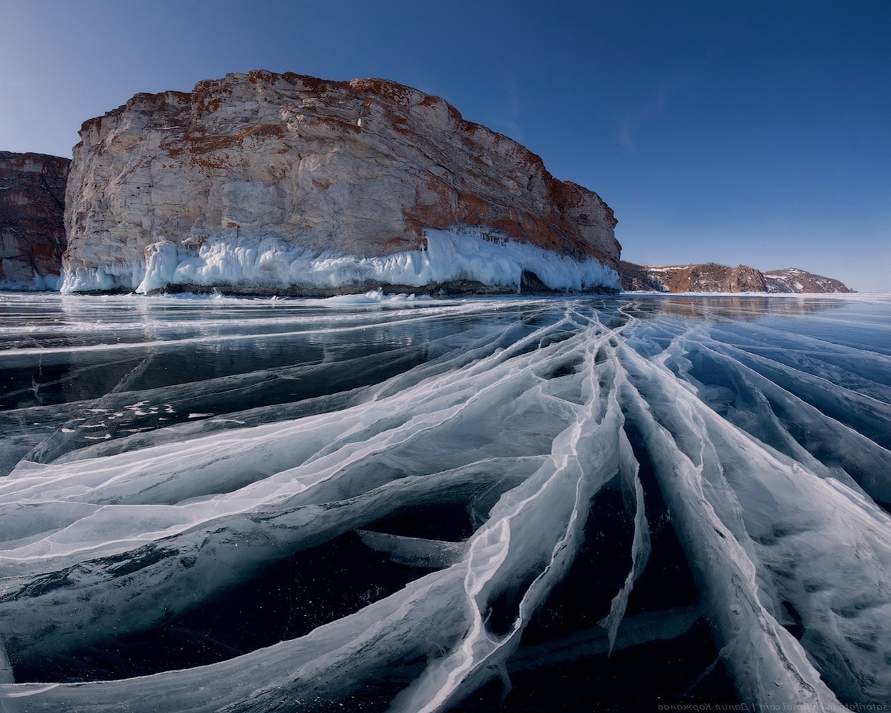 Fotopayazage com a imagem de um lago transparente entre as pedras contra o fundo de uma Alta Floresta de coníferas e montanhas