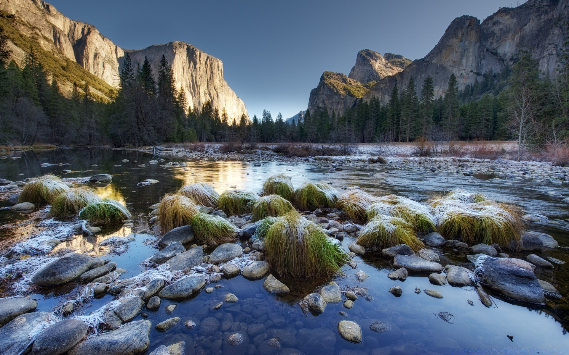 Lago de montanha transparente no fundo de rochas de pedra e árvores