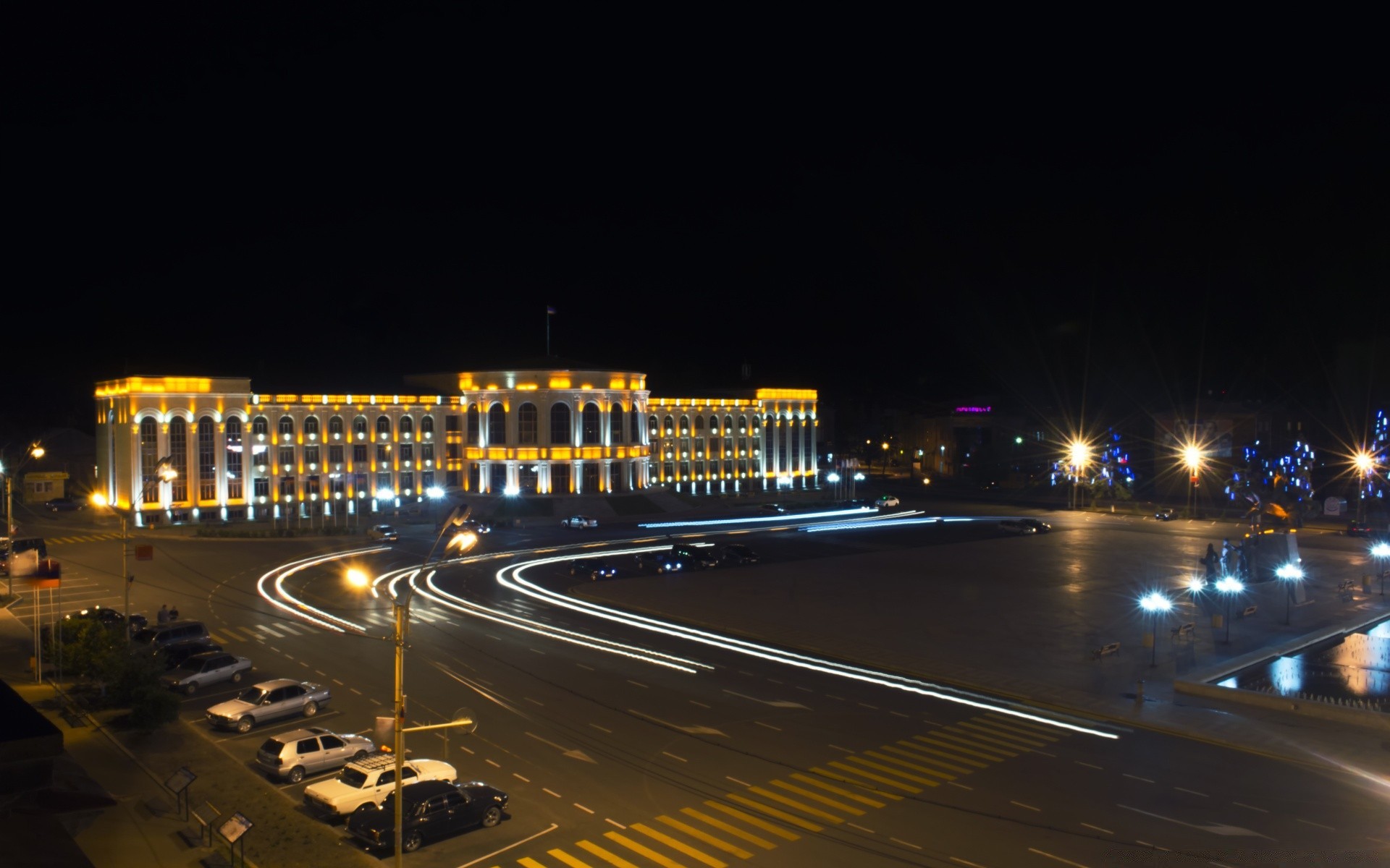 Paisagem noturna dinâmica com arranha-céus e rodovias