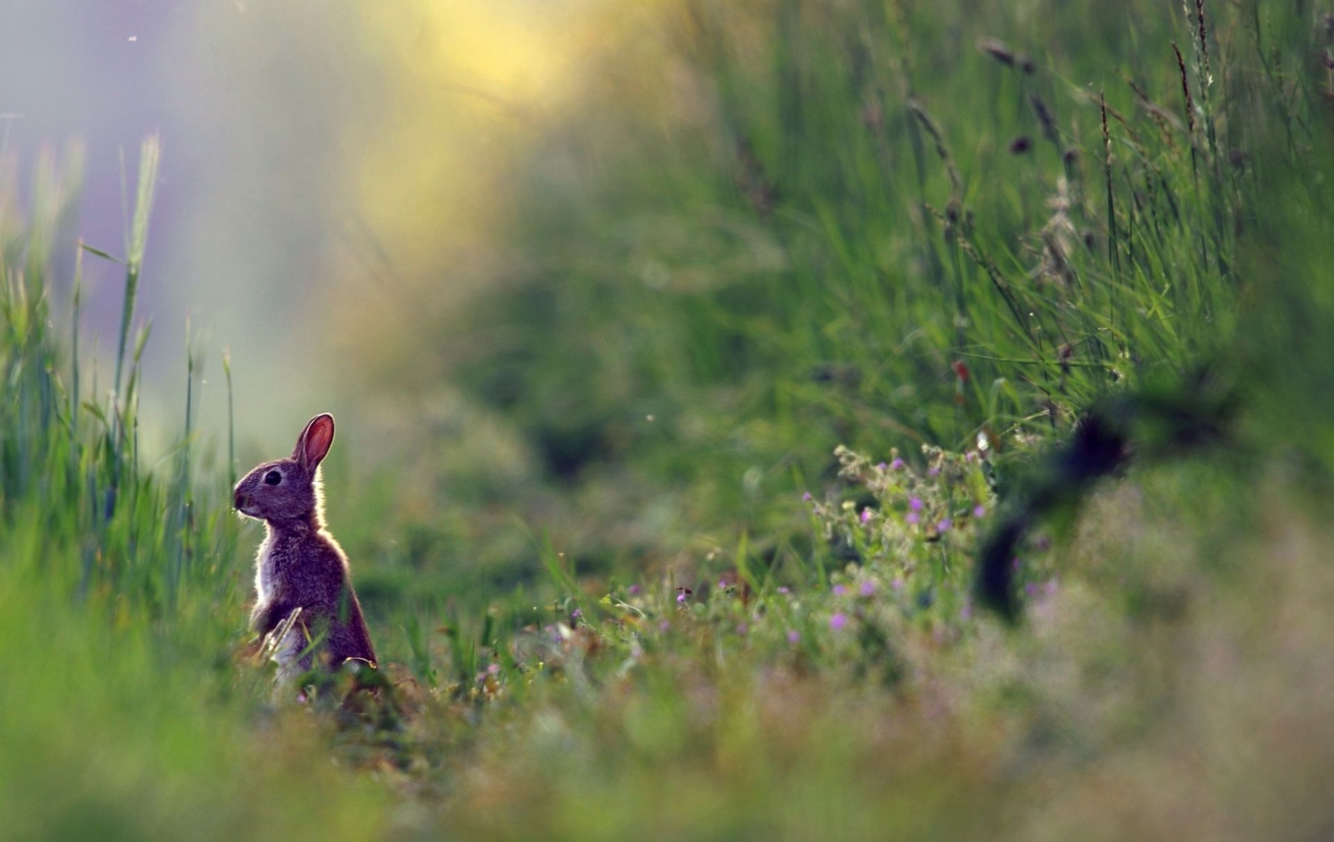 Na grama nas patas traseiras está uma lebre e olha atentamente